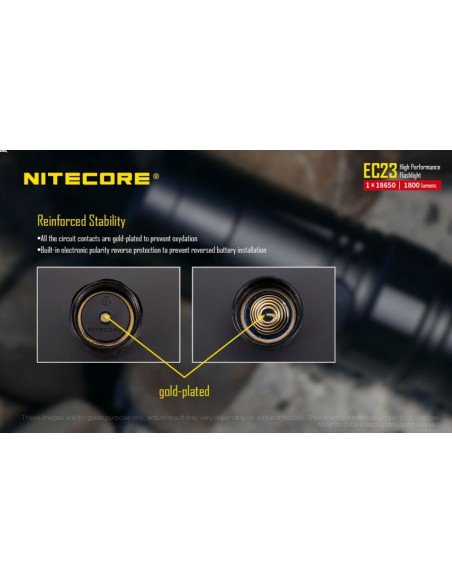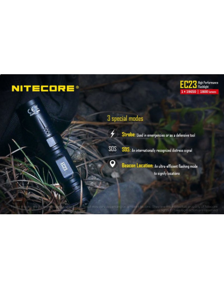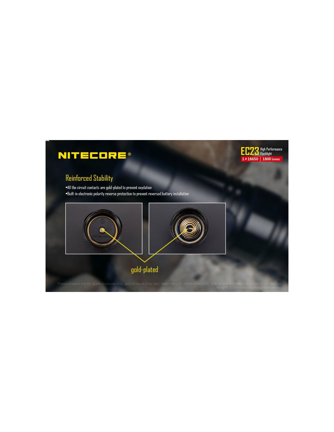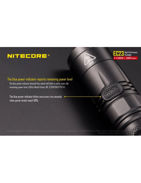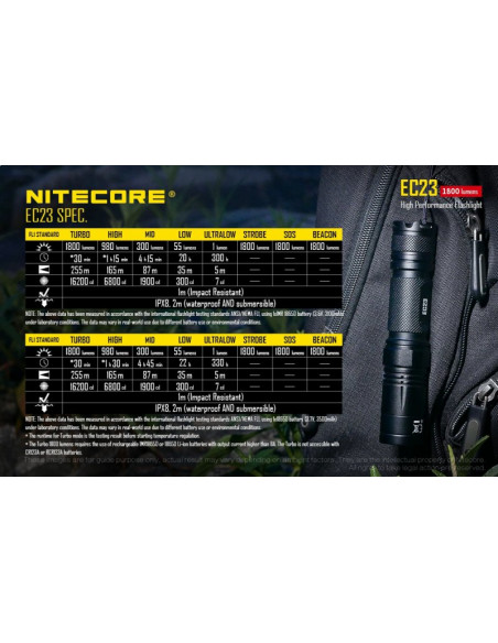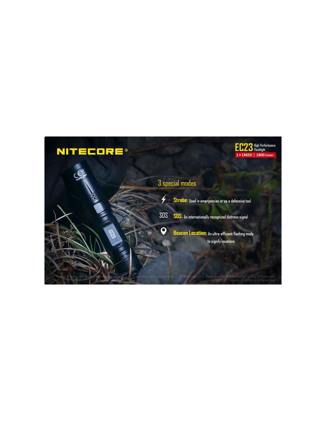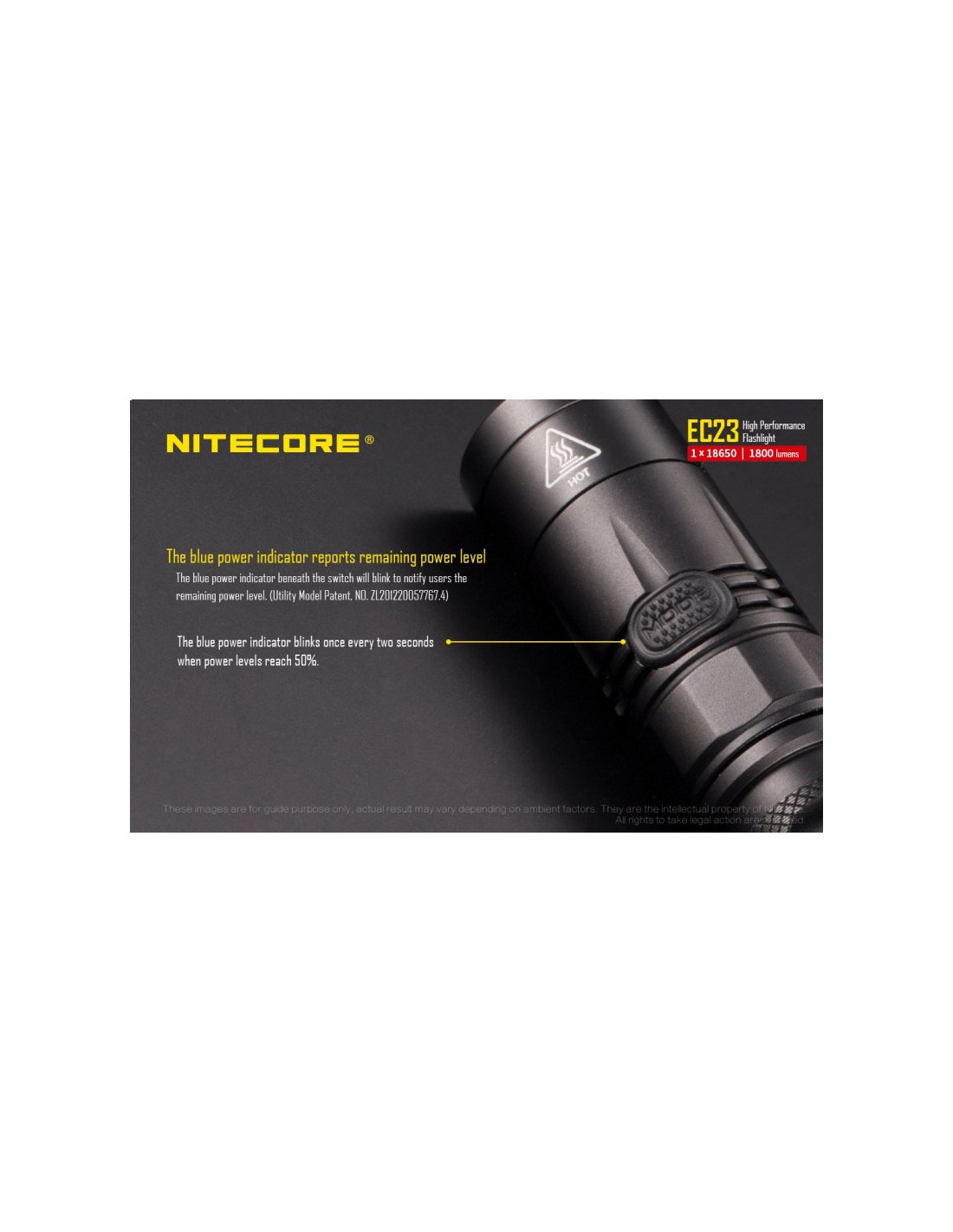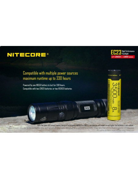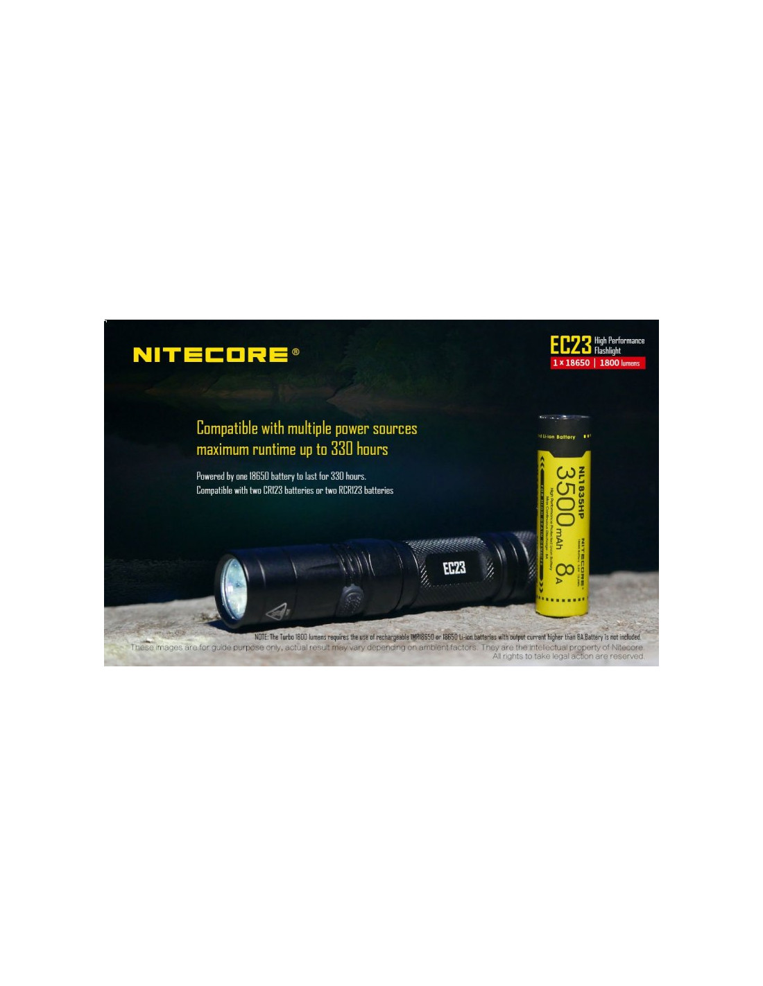Źródłem zasilania Latarki Nitecore EC23 jest akumulator 18650, który jest wstanie działać do 330 godzin.