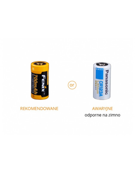 Fenix E18R może być zasilany za pomocą jednorazowej baterii CR123 lub ładowalnego akumulatora 16340, który zapewnia lepsze parametry świecenia oraz minimalizuje koszty związane z eksploatacją latarki.