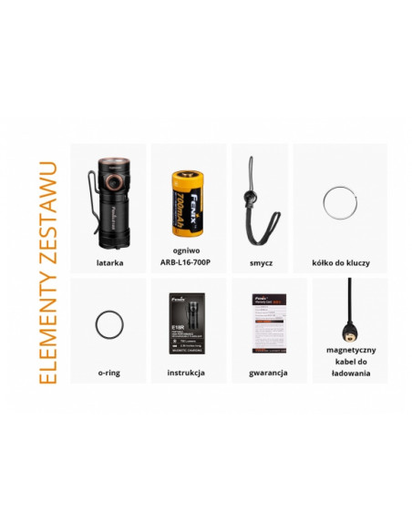 - Elementy zestawu latarki: akumulator Fenix ARB-L16 (16340; 700 mAh; 3,6 V; Li-ion) ×1 ,