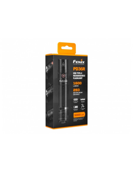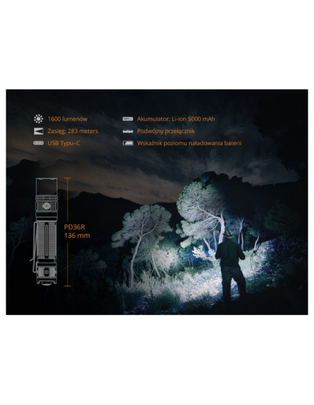 Fenix PD36R to niewielka latarka taktyczna o potężnym strumieniu światła 1600 lumenów, zasięgu maksymalnym 283 m, zasilana wydajnym akumulatorem typu 21700 5000 mAh, ładowanym przez port USB-C.