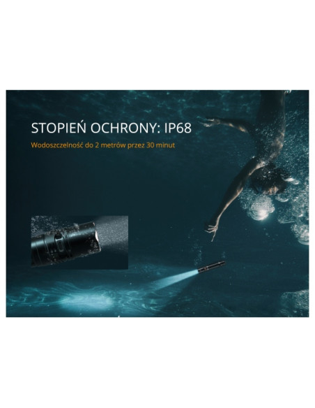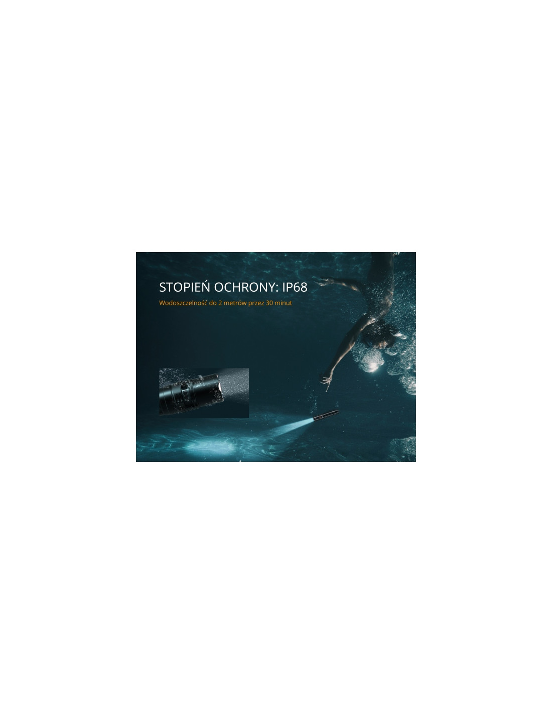 Latarka zasilana jest ogniwem typu 21700 o potężnej pojemności aż 5000 mAh! Zastosowany akumulator ma dwukrotnie większą pojemność niż standardowe ogniwo 18650 co w oczywisty sposób przekłada się na ogromną wydajność i imponujący czas pracy.