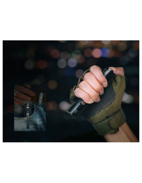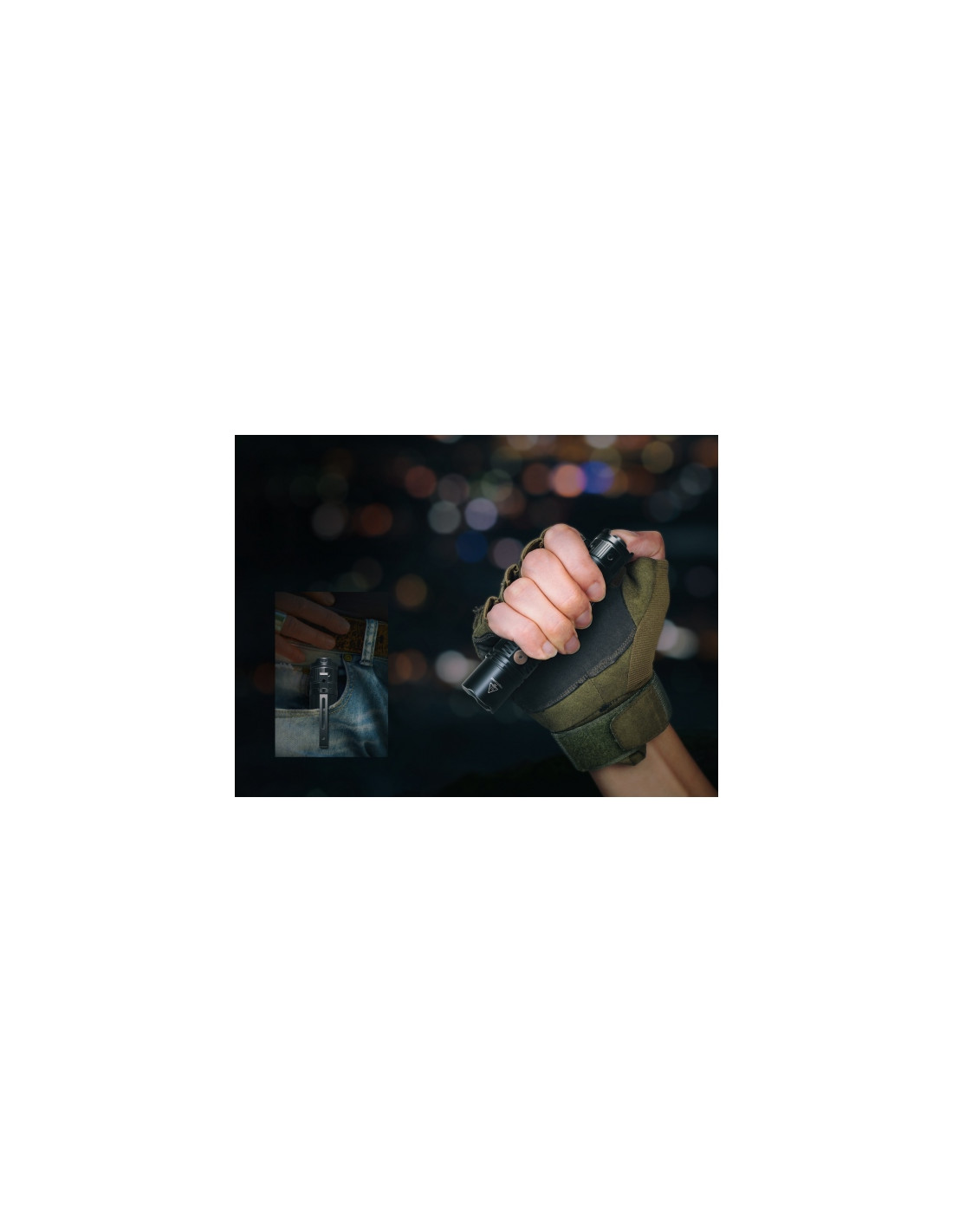 Odłączany klips zapobiega także stoczeniu się latarki z pochyłej powierzchni. Latarka została wyposażona w dwa włączniki: tylny do aktywacji światła (chwilowego oraz stałego) oraz boczny do zmiany trybów.