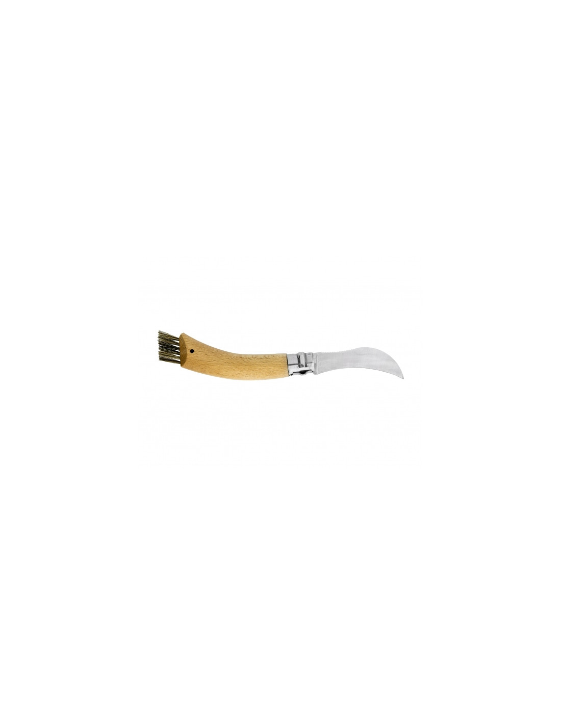 Profesjonalny nóż dla miłośników zbierania grzybów, wyposażony w sierpowate ostrze i pędzelek do oczyszczania grzybów.