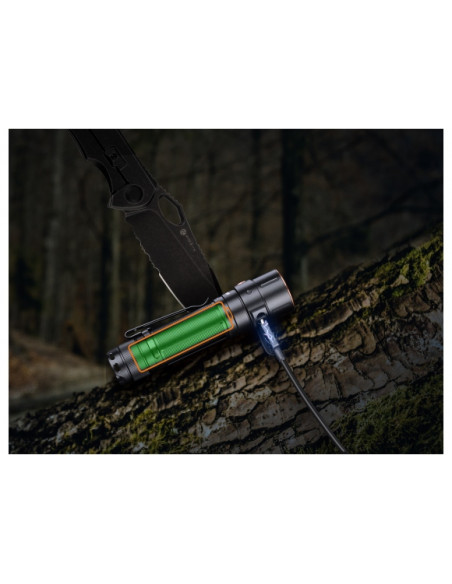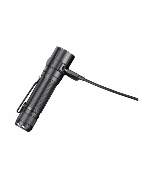 Latarka ma wbudowany port ładowania USB-C, który umożliwia ładowanie akumulatora bez potrzeby korzystania z dodatkowej ładowarki. Wystarczy standardowy kabel USB-C (w zestawie) i źródło prądu np. power bank, laptop, komputer stacjonarny lub samochodowa ładowarka z gniazdem USB.