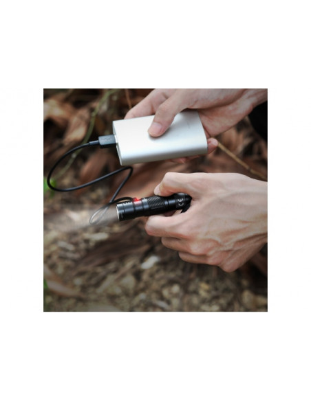 Do zasilania latarki zastosowano akumulator litowo-polimerowy o pojemności 800 mAh, który ładujemy przez ukryty port USB-C. Dostęp do gniazda ładowania uzyskujemy dopiero po rozsunięciu korpusu latarki, dzięki czemu port jest należycie zabezpieczony przed zabrudzeniem i wilgocią. W odróżnieniu od innych latarek z portem USB, Fenix E09R nawet podczas ładowania może świecić.