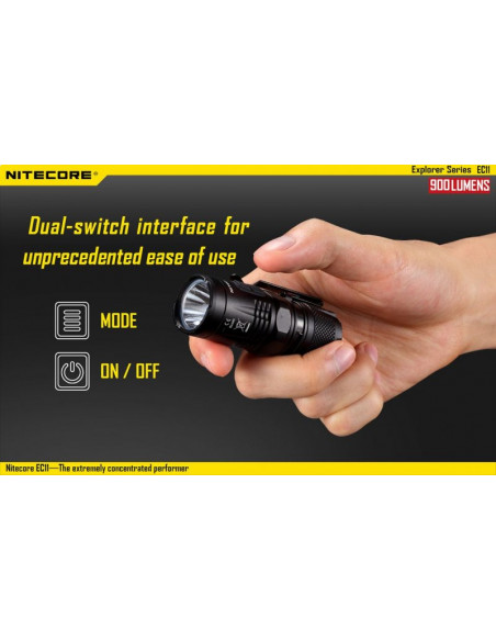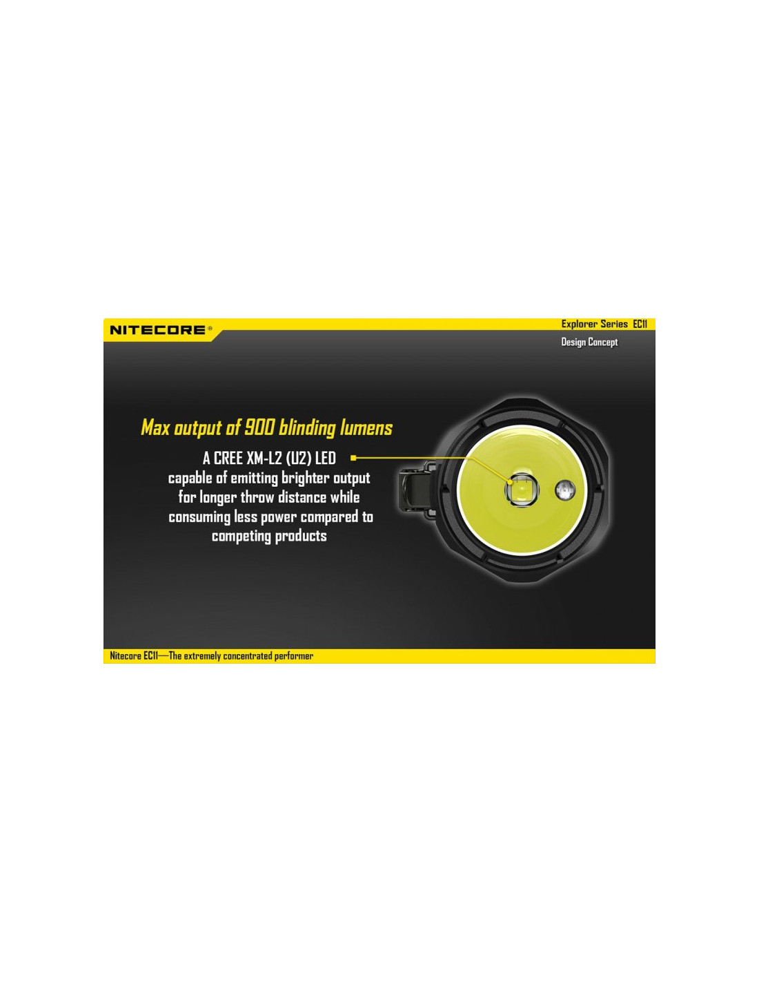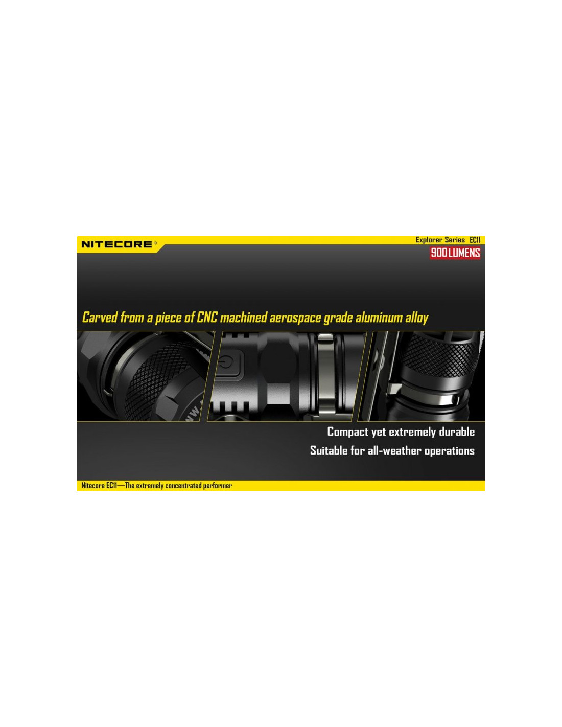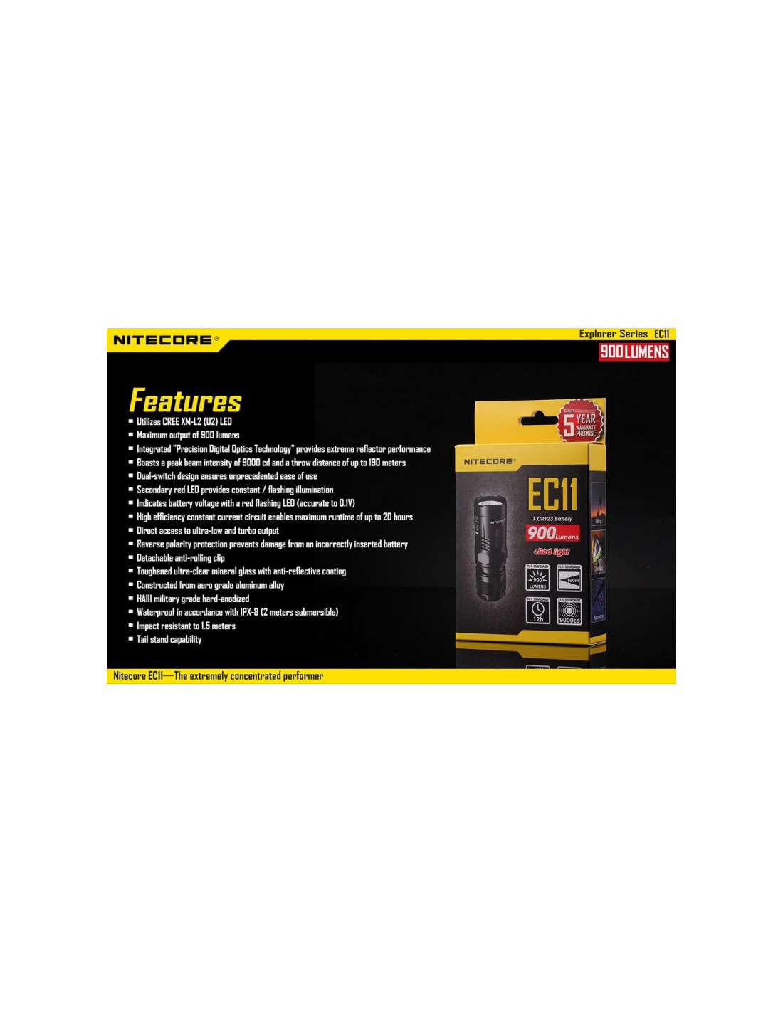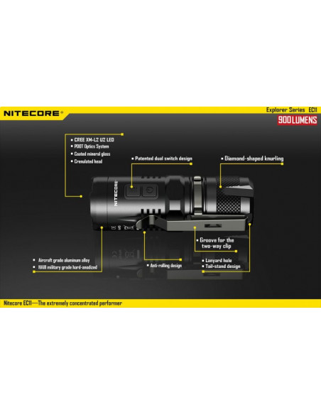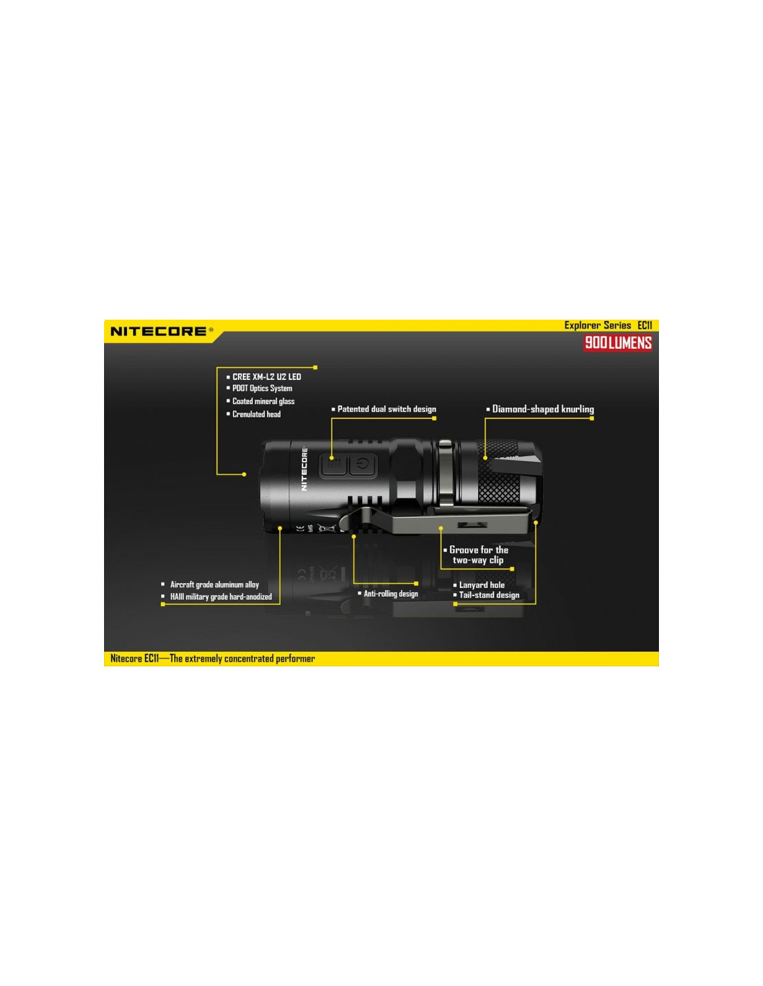 Latarka LED Nitecore EC11 o mocy 900 lumenów oferuje skuteczny zasięg do 190 metrów. Źródłem światła w latarce jest dioda LED CREE XM-L2 Us i reflektor SMO.