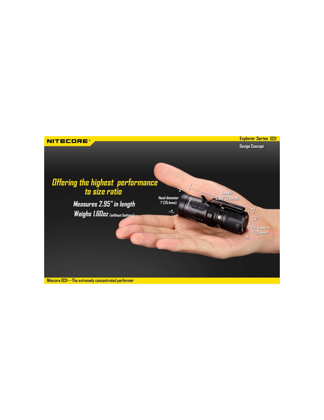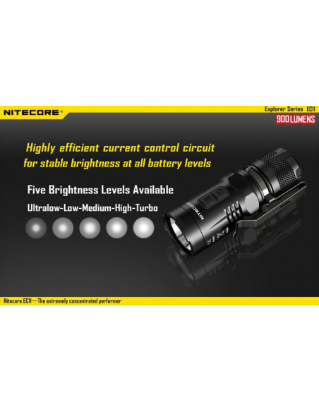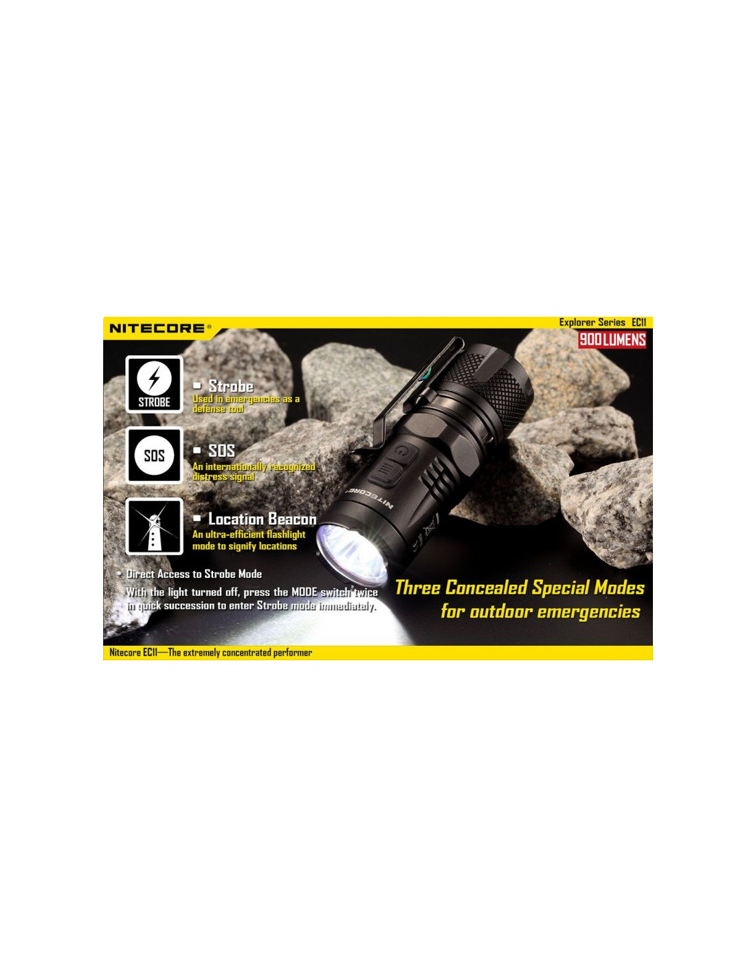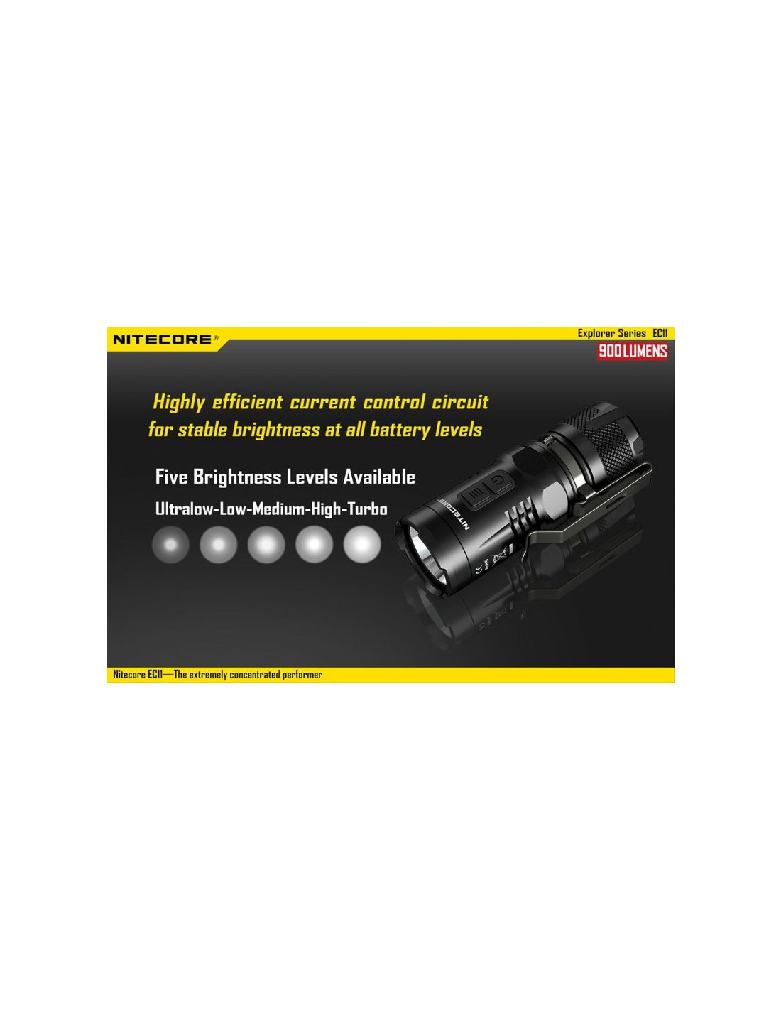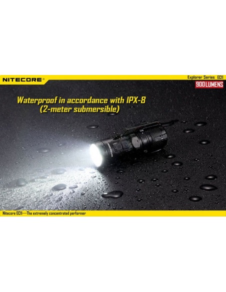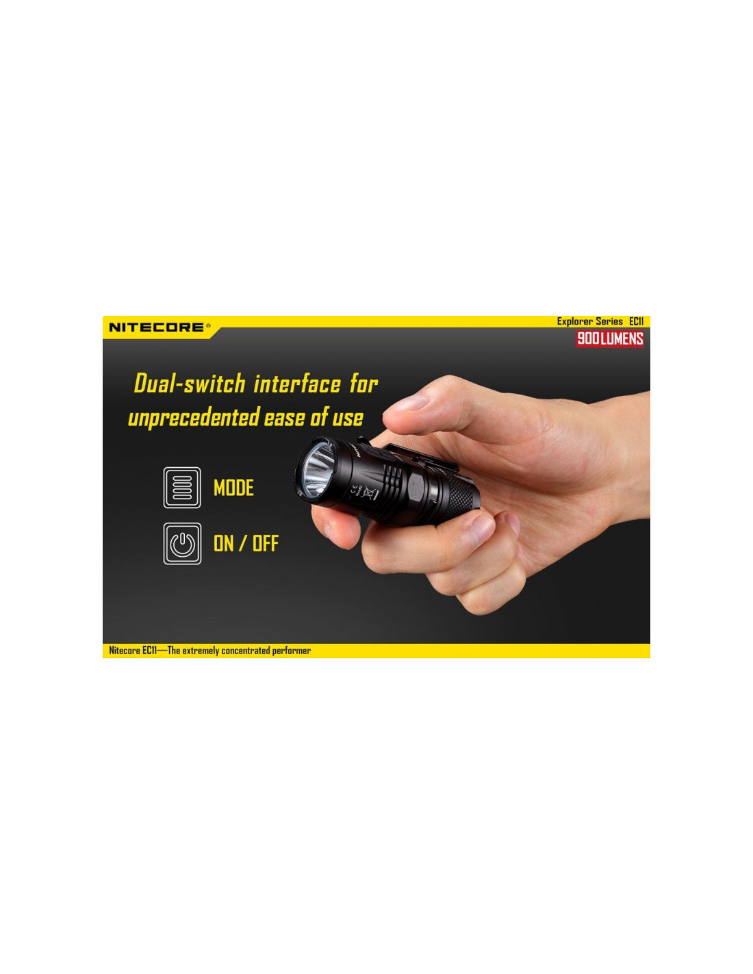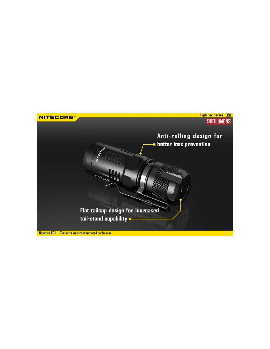 Latarka LED Nitecore EC11 o mocy 900 lumenów oferuje skuteczny zasięg do 190 metrów. Źródłem światła w latarce jest dioda LED CREE XM-L2 Us i reflektor SMO.