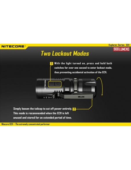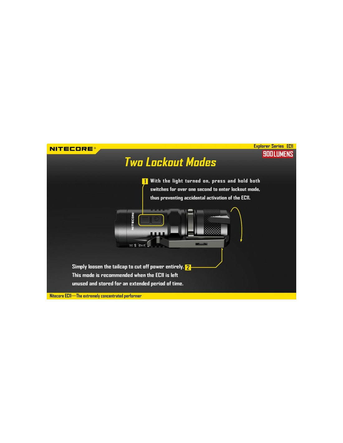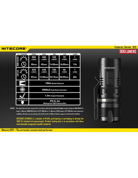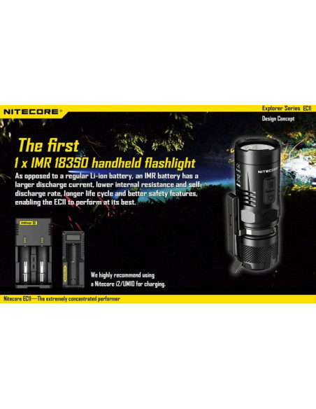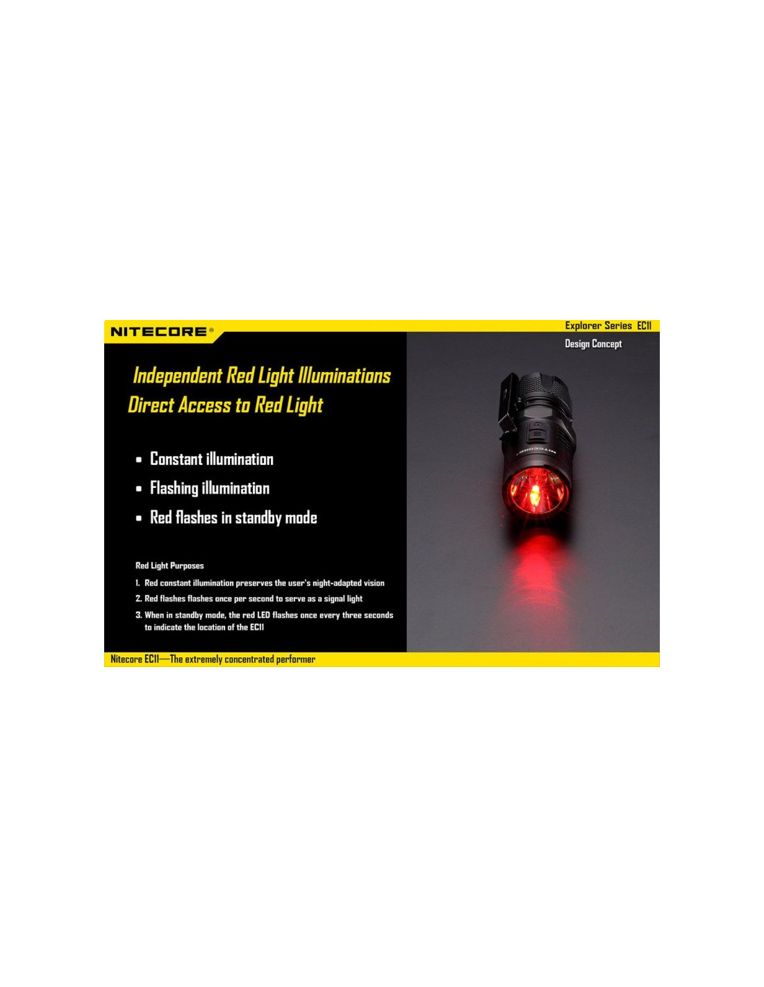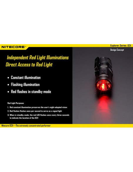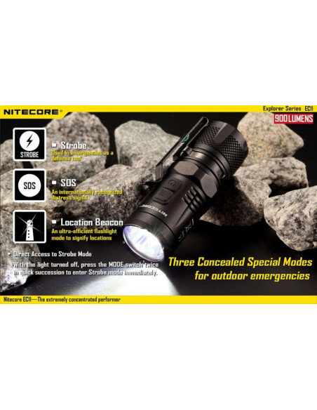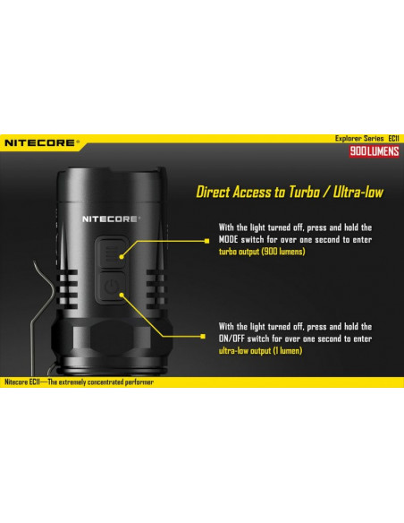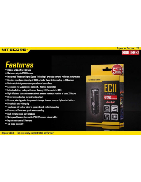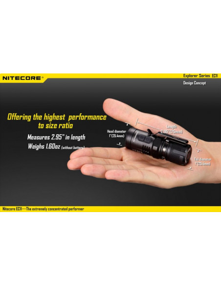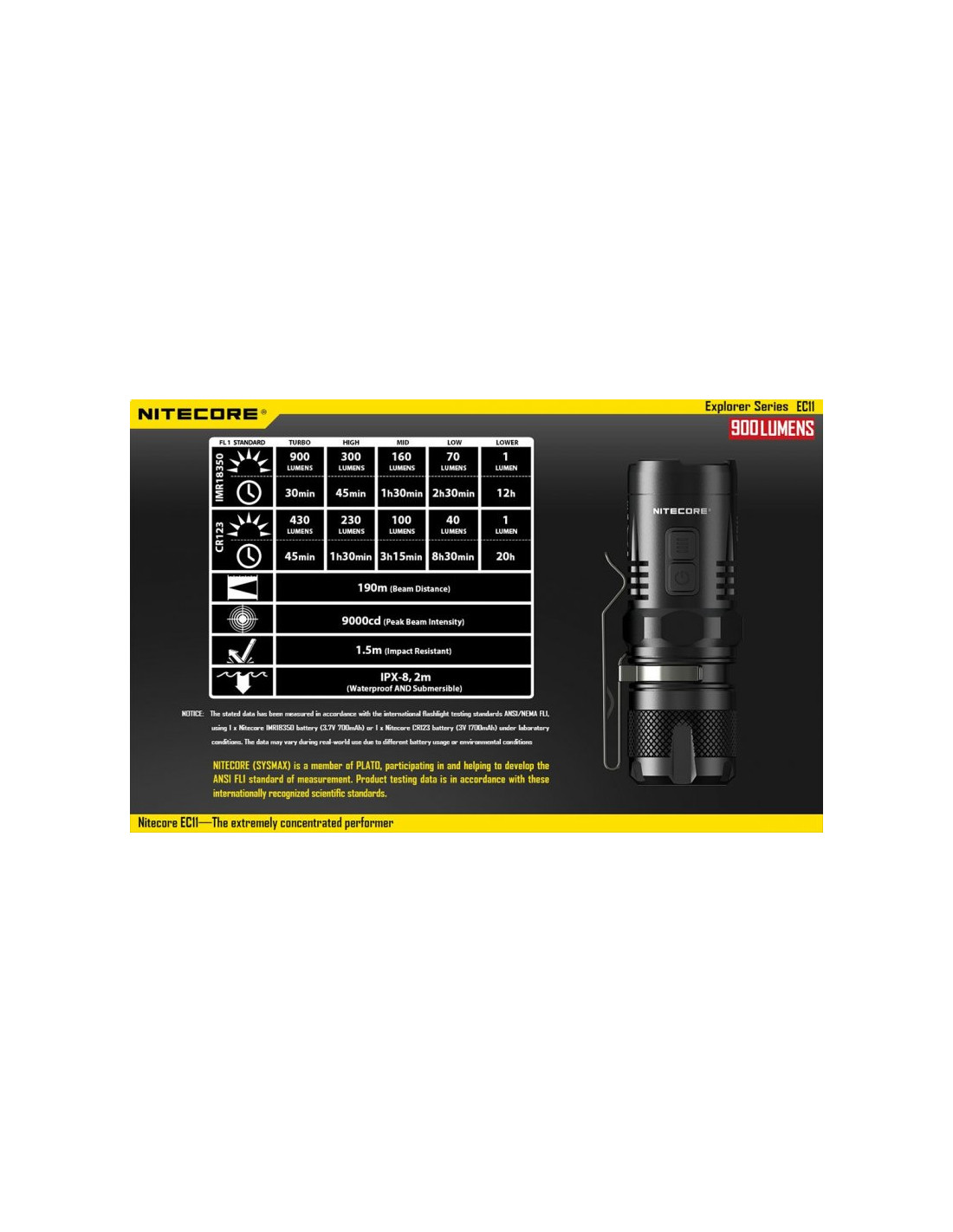 Latarka LED Nitecore EC11 o mocy 900 lumenów oferuje skuteczny zasięg do 190 metrów. Źródłem światła w latarce jest dioda LED CREE XM-L2 Us i reflektor SMO.