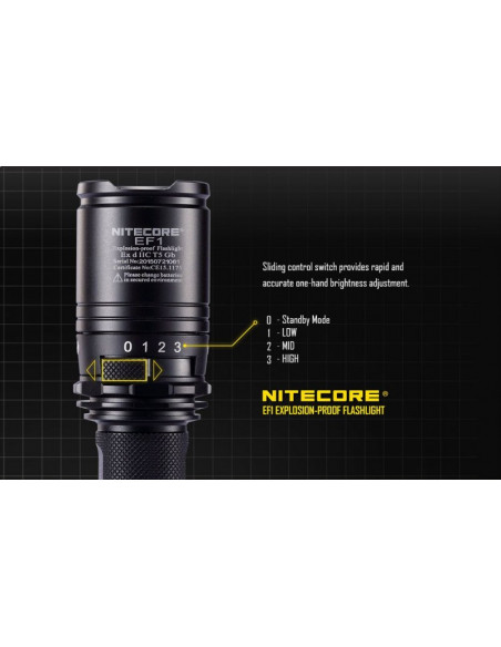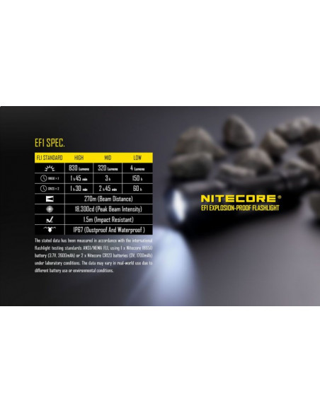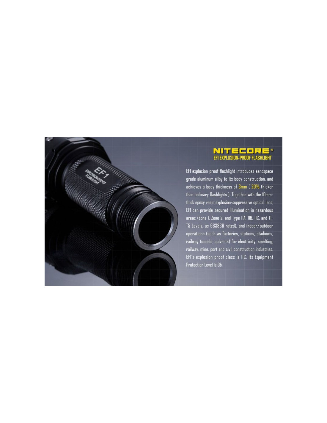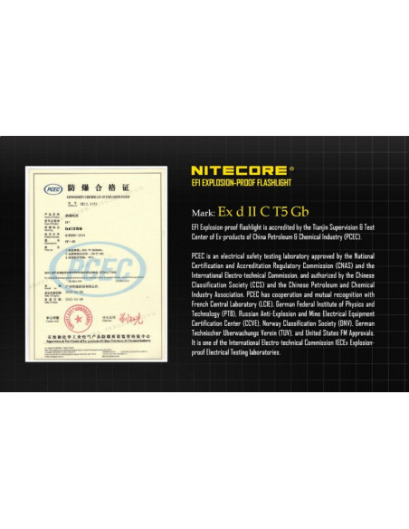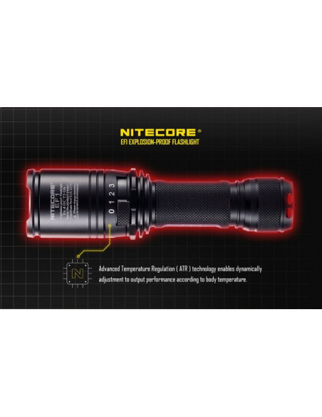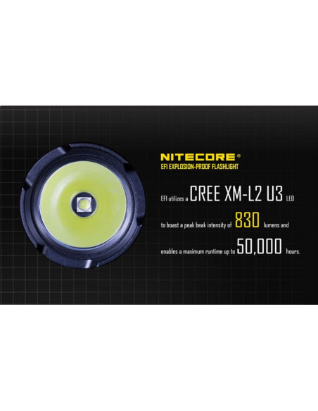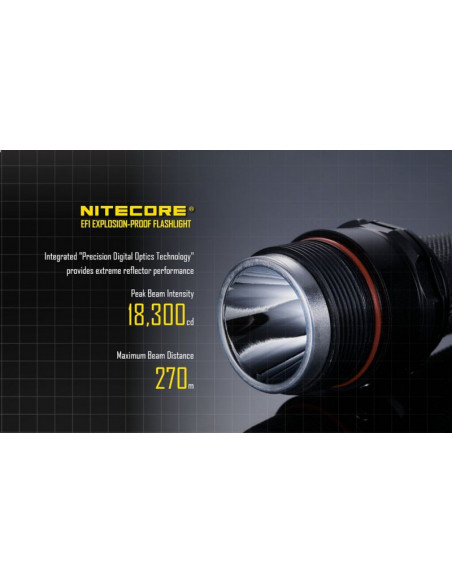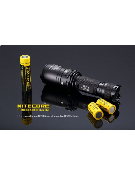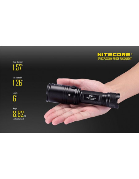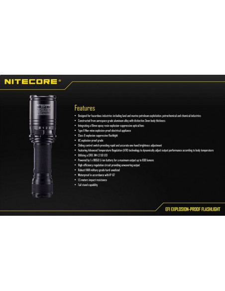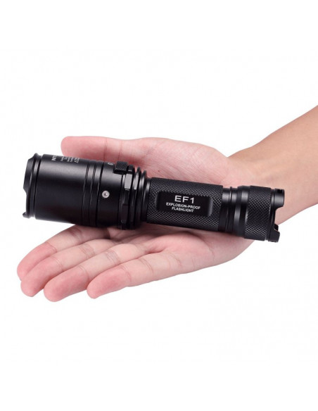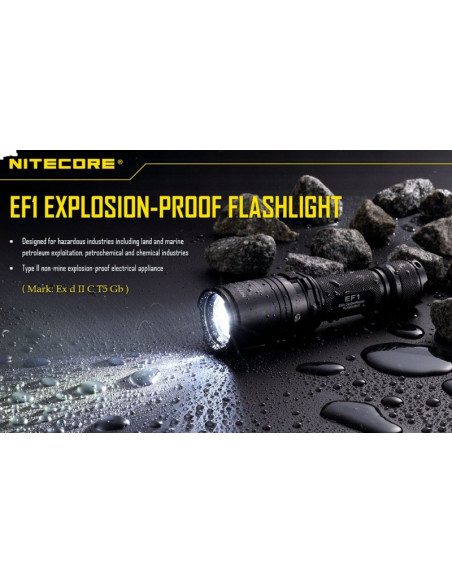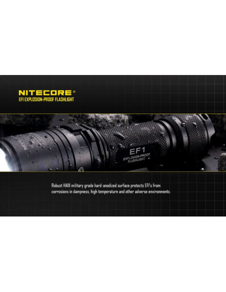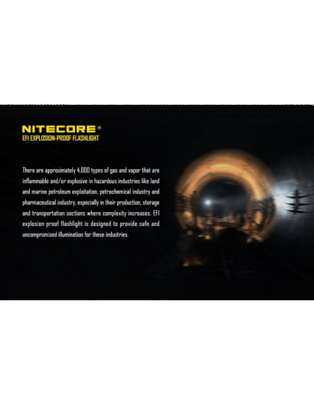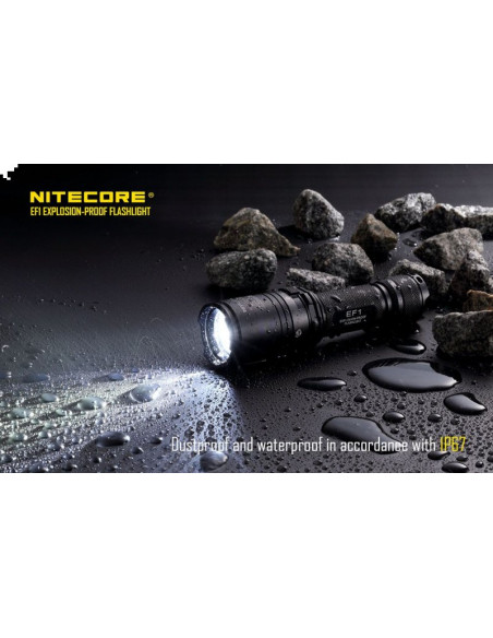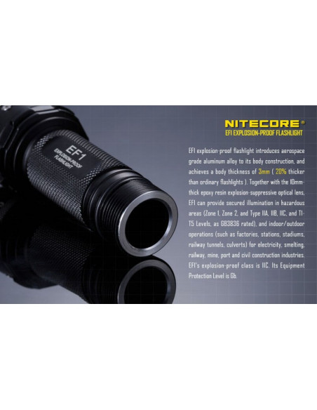 Latarka jest wyposażona w soczewki z żywicy epoksydowej o grubości 10 mm. Latarka Nitecore EF1 może służyć jako bezpieczne oświetlenie w strefach zagrożonych wybuchem, a także w fabrykach, dworcach, stadionach, tunelach kolejowych. To doskonałe wyposażenie dla firm z branży elektrycznej, hutniczej, kolejowej, morskiej, a także firm zajmujących się wydobyciem surowców w kopalniach. Wytrzymała latarke EF1 wytrzymuje działanie temperatur sięgających nawet 100 stopni Celsjusza.
