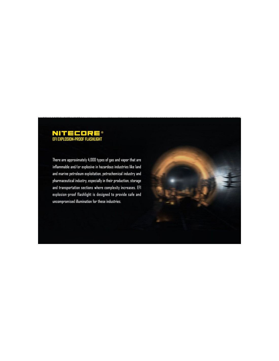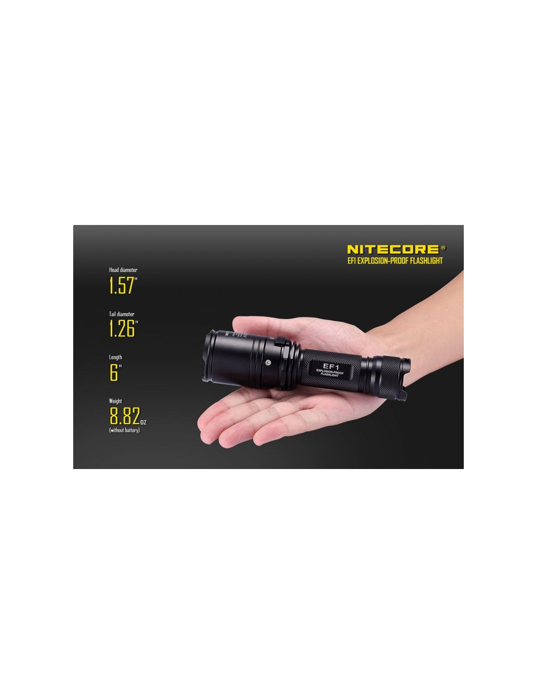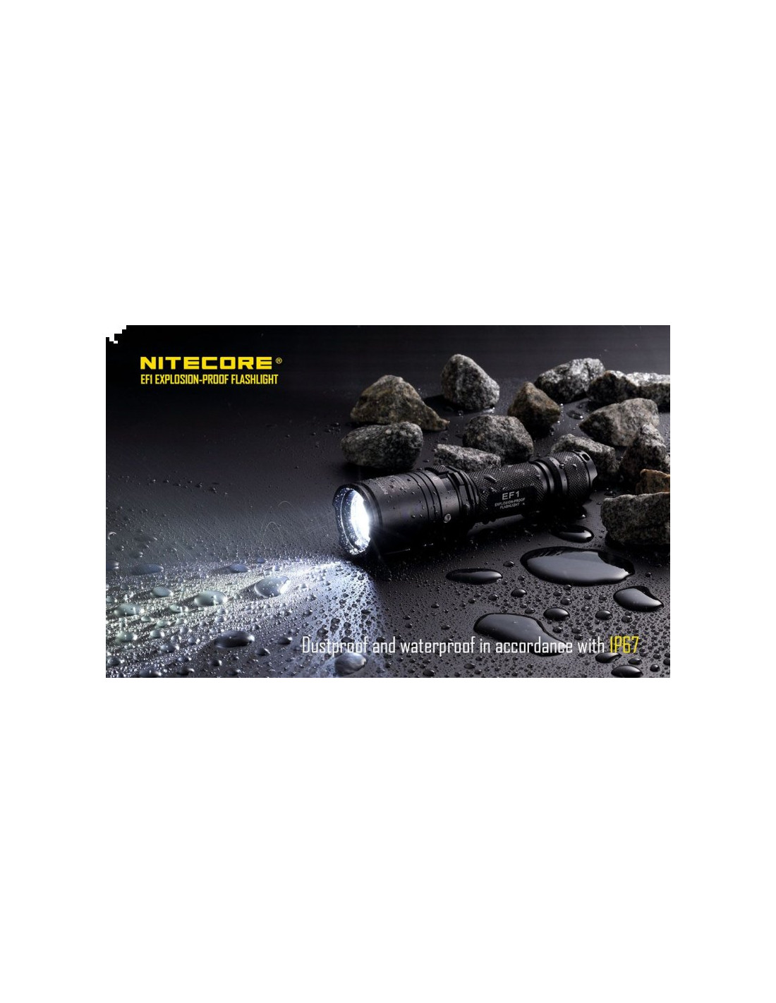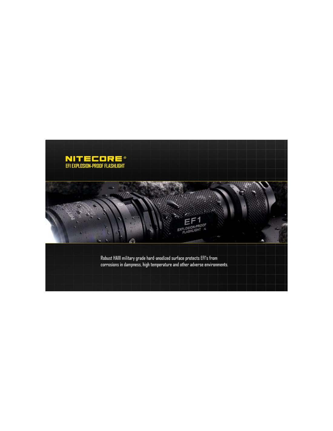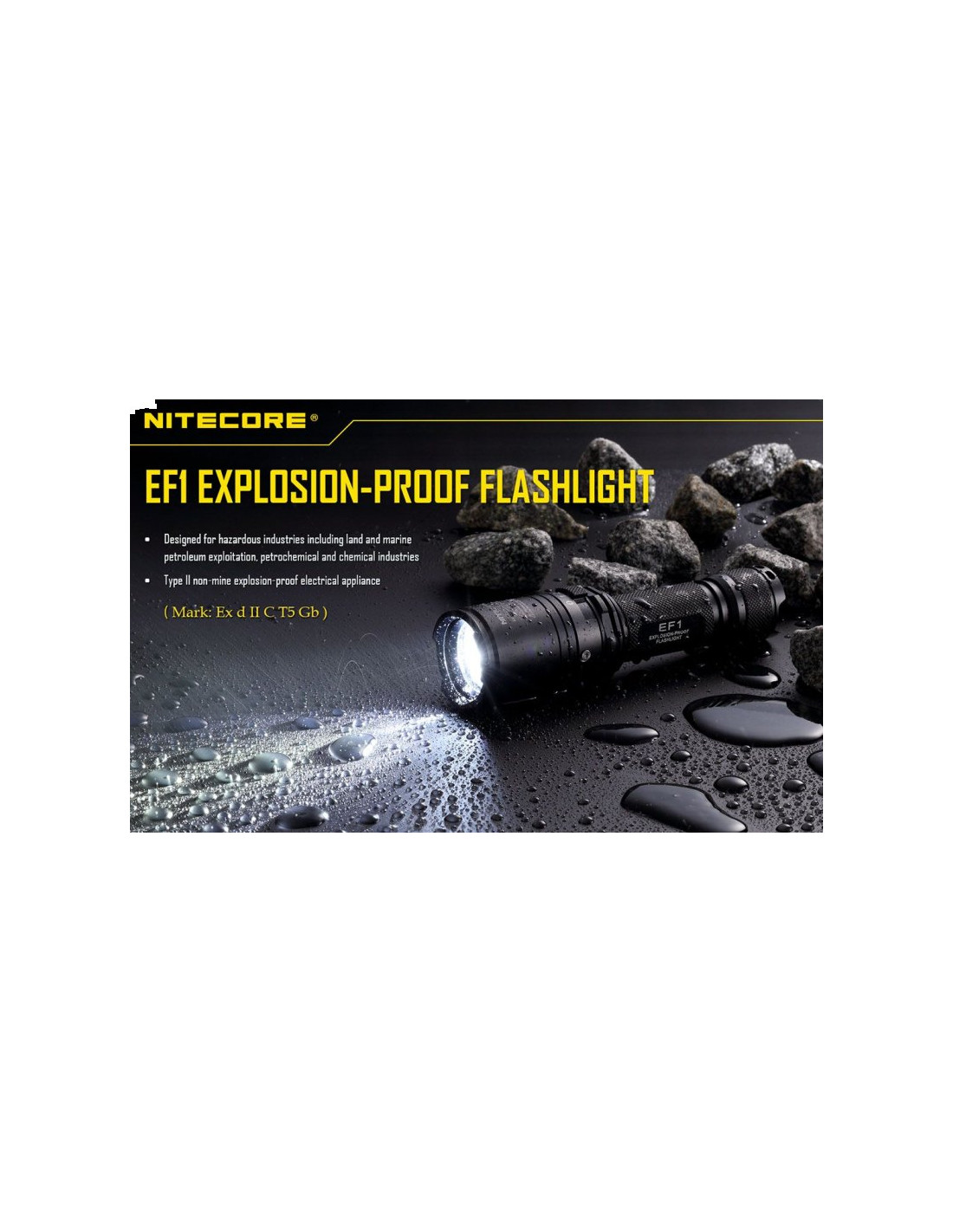 Latarka jest wyposażona w soczewki z żywicy epoksydowej o grubości 10 mm. Latarka Nitecore EF1 może służyć jako bezpieczne oświetlenie w strefach zagrożonych wybuchem, a także w fabrykach, dworcach, stadionach, tunelach kolejowych. To doskonałe wyposażenie dla firm z branży elektrycznej, hutniczej, kolejowej, morskiej, a także firm zajmujących się wydobyciem surowców w kopalniach. Wytrzymała latarke EF1 wytrzymuje działanie temperatur sięgających nawet 100 stopni Celsjusza.