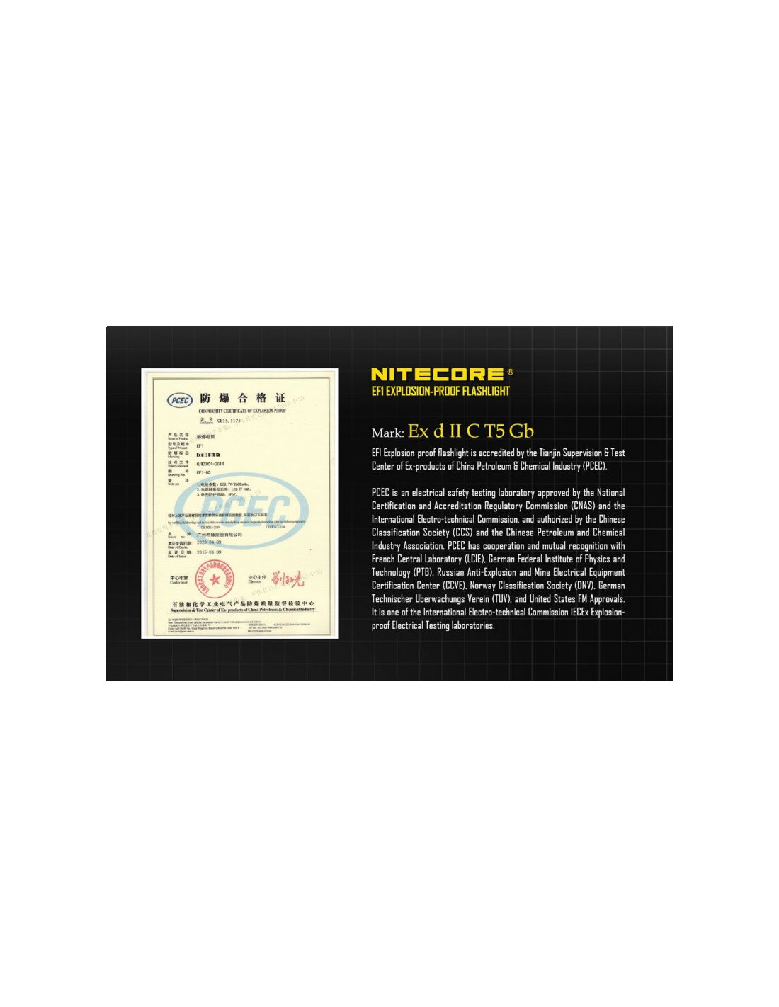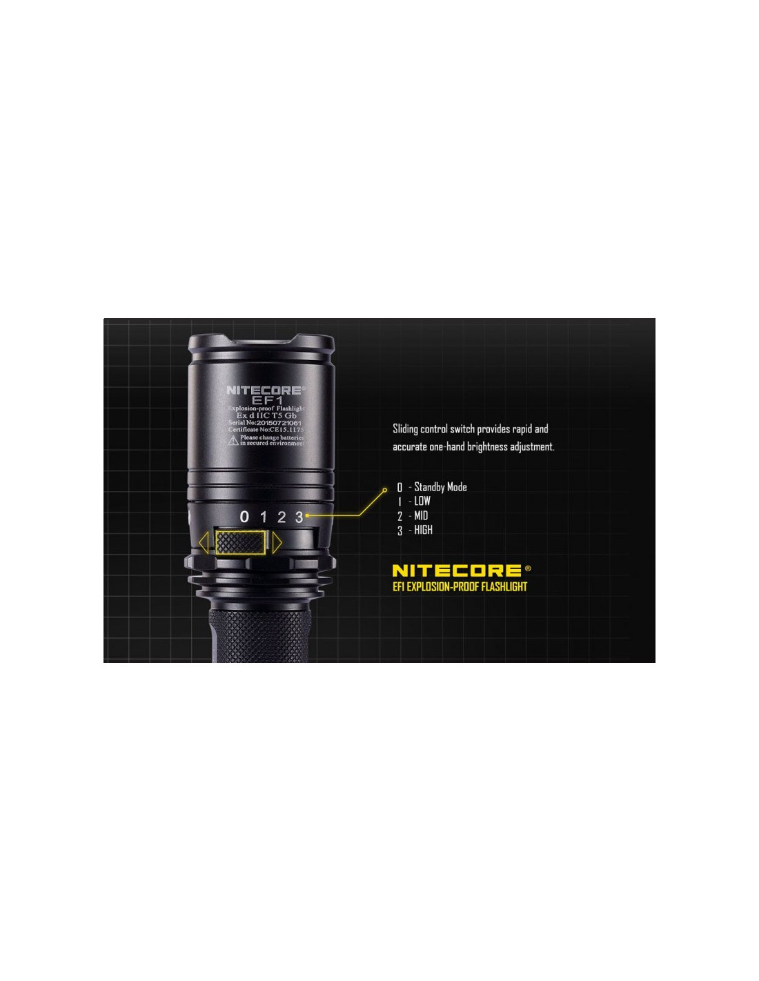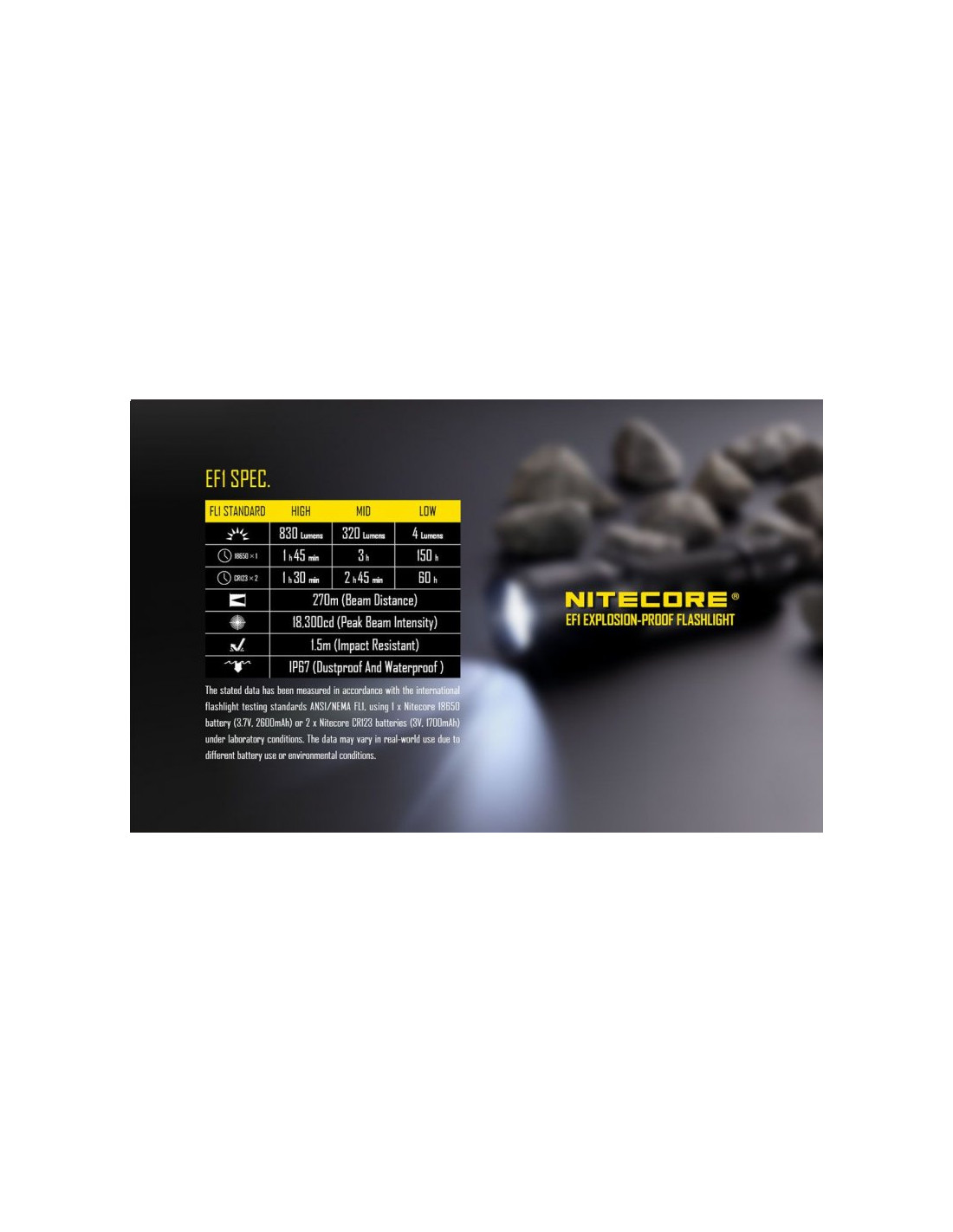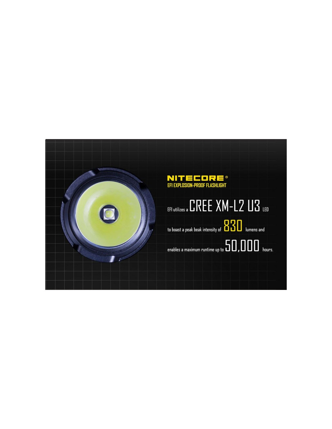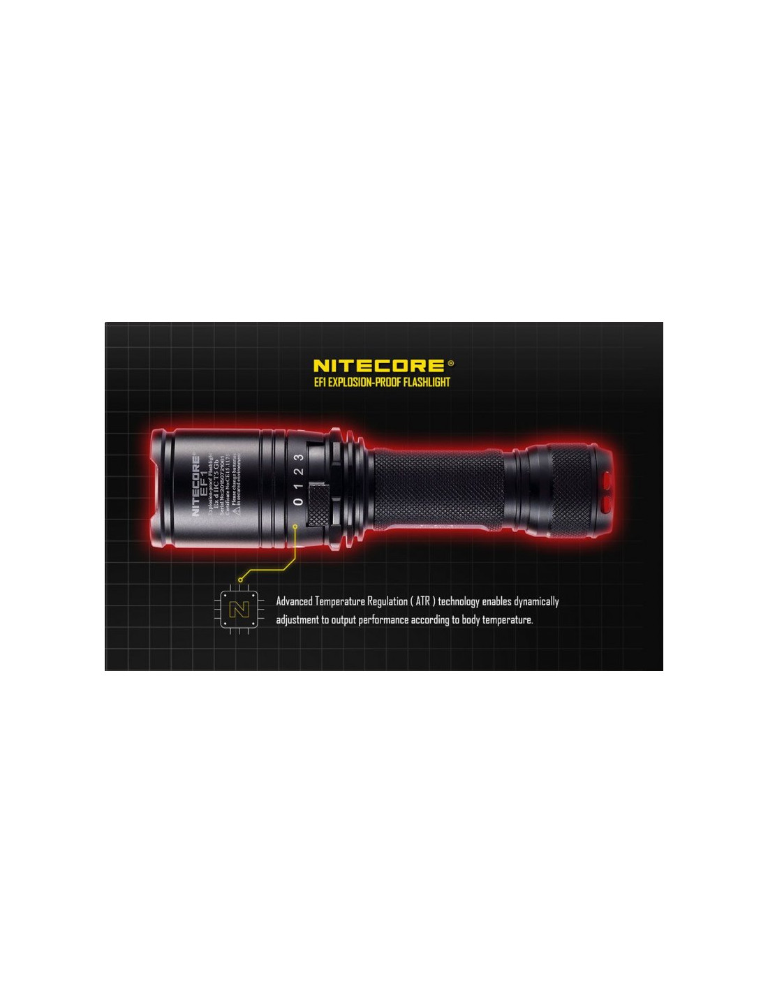 Latarka jest wyposażona w soczewki z żywicy epoksydowej o grubości 10 mm. Latarka Nitecore EF1 może służyć jako bezpieczne oświetlenie w strefach zagrożonych wybuchem, a także w fabrykach, dworcach, stadionach, tunelach kolejowych. To doskonałe wyposażenie dla firm z branży elektrycznej, hutniczej, kolejowej, morskiej, a także firm zajmujących się wydobyciem surowców w kopalniach. Wytrzymała latarke EF1 wytrzymuje działanie temperatur sięgających nawet 100 stopni Celsjusza.