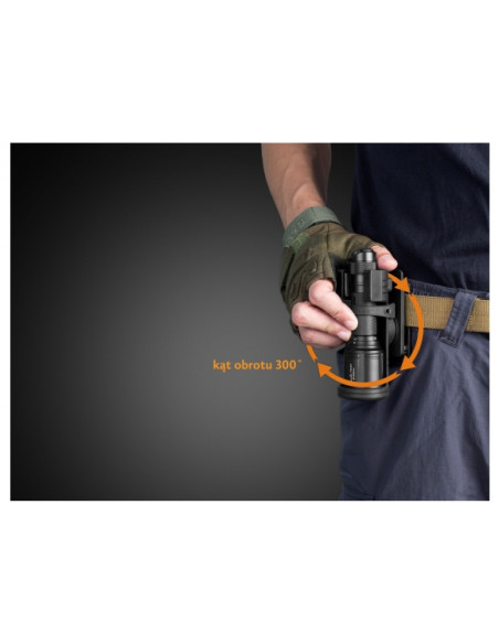 ALC-01 to uchwyt do szybkiego reagowania dla wszystkich, którzy chcą mieć wolne ręce. Specjalne zapięcie do paska umożliwia szybkie skierowanie źródła światła bez wyjmowania latarki dzięki wbudowanemu mechanizmowi umożliwiającemu obrót o kącie 300°.