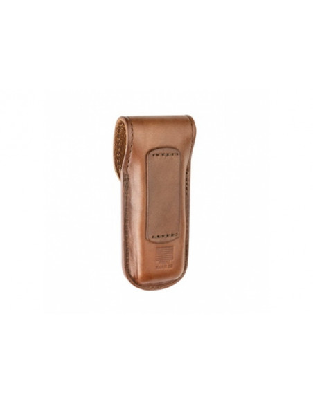 Etui wykonano z naturalnej skóry licowej o jasnobrązowym wykończeniu. Przed wypadnięciem toola zapobiega klapka zapinaną na metalowego napa. Szlufka umożliwiająca przenoszenie etui przy boku pasuje do większości pasów casual oraz militarnych.