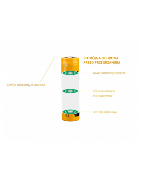 Producent zastosował wielopoziomowy system zabezpieczeń, który w maksymalnym stopniu wydłuża żywotność i zapewnia najwyższy poziom bezpieczeństwa akumulatora.