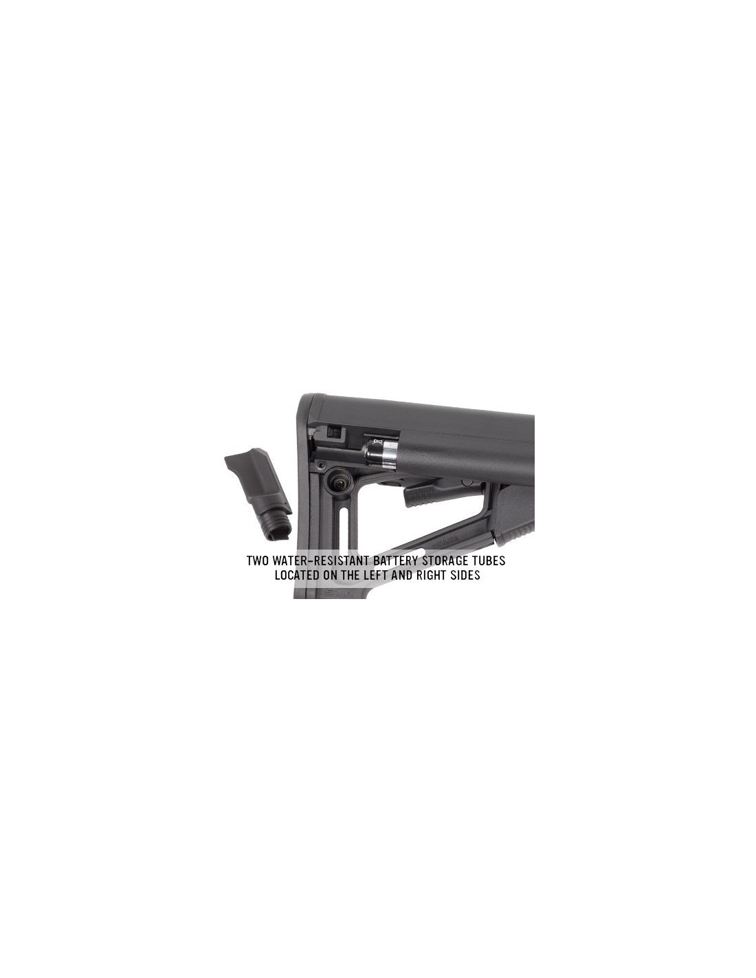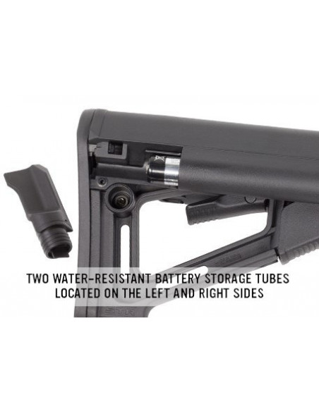 Po obu stronach kolby są wbudowane schowki na baterie.