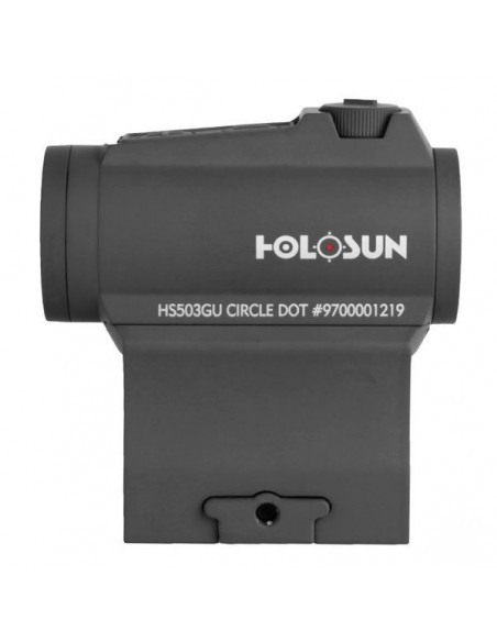 Seria Micro Red Dot marki Holosun składa się z niewielkich kolimatorów o niskiej wadze, dzięki czemu świetnie nadają się do uprawiania sportów strzeleckich. Model HS503GU posiada możliwość wyboru 2 punktów celowniczych, kropka 2 MOA z okręgiem 65 MOA oraz samej kropki 2 MOA. Kolimator ten ma w zestawie dwa montaże w komplecie: niski i wysoki 1/3 Co-Witness. Wersja z baterią umieszczaną z boku obudowy w zakręcanym przedziale.