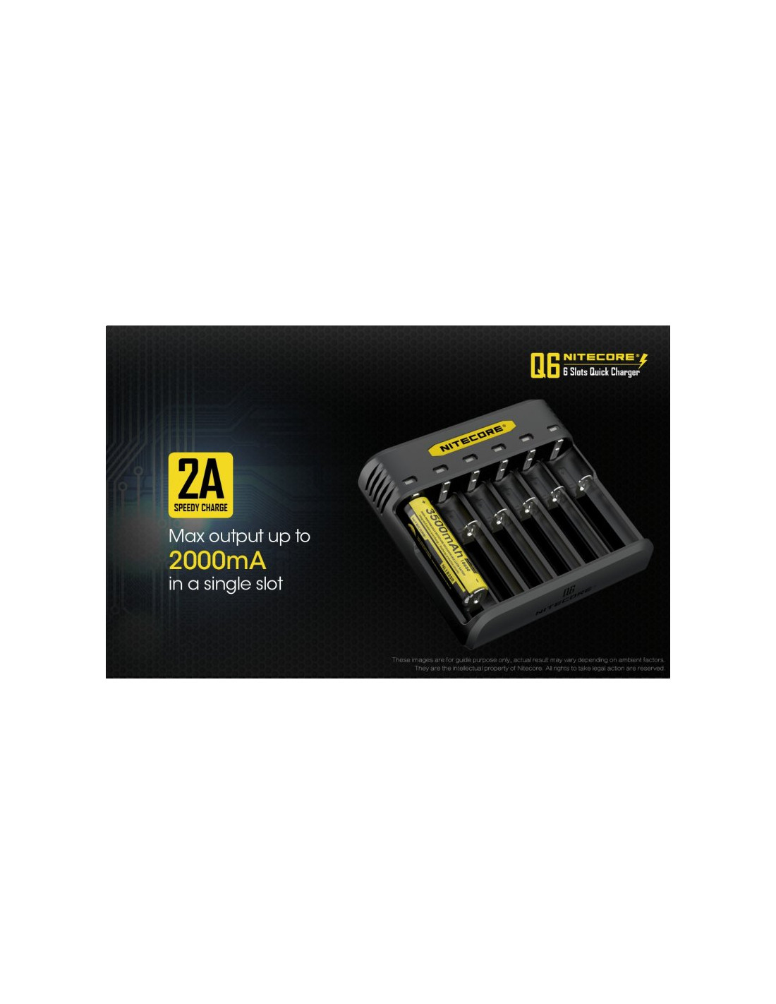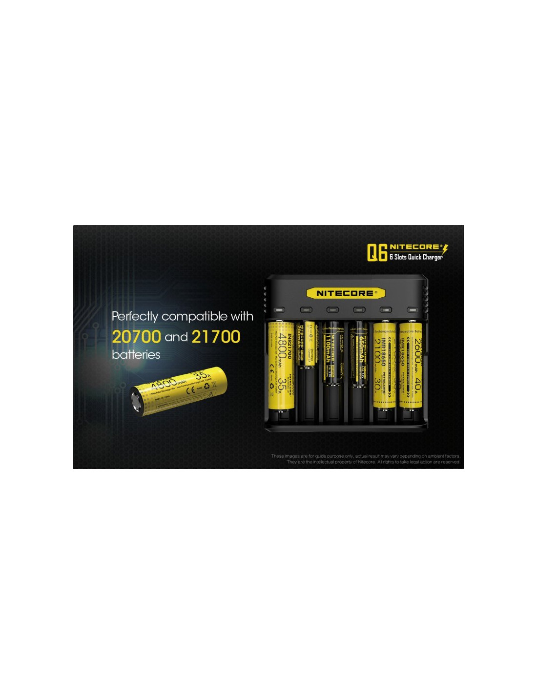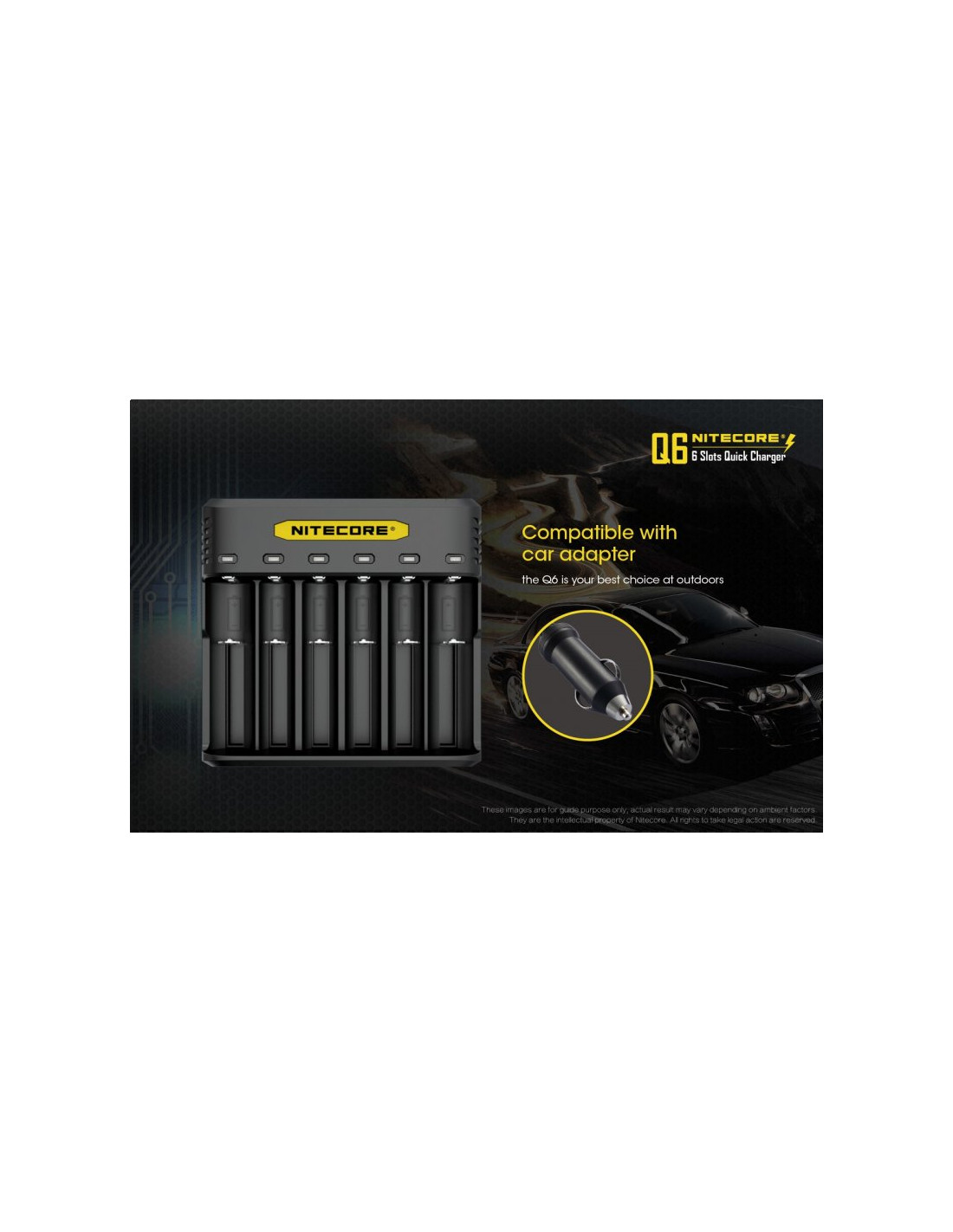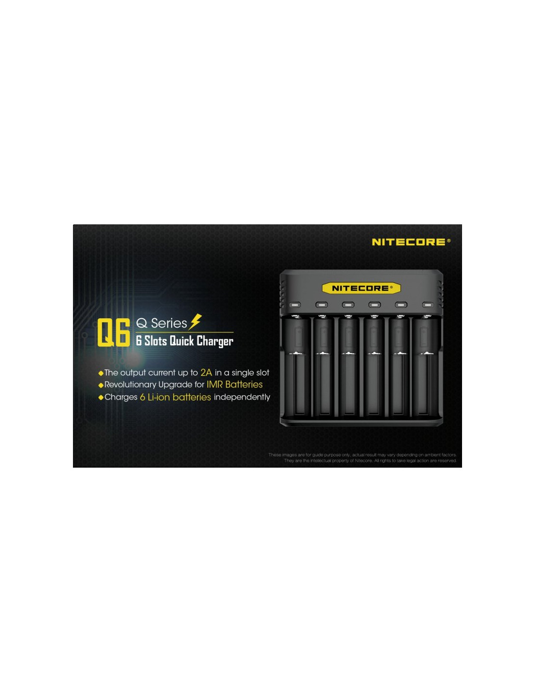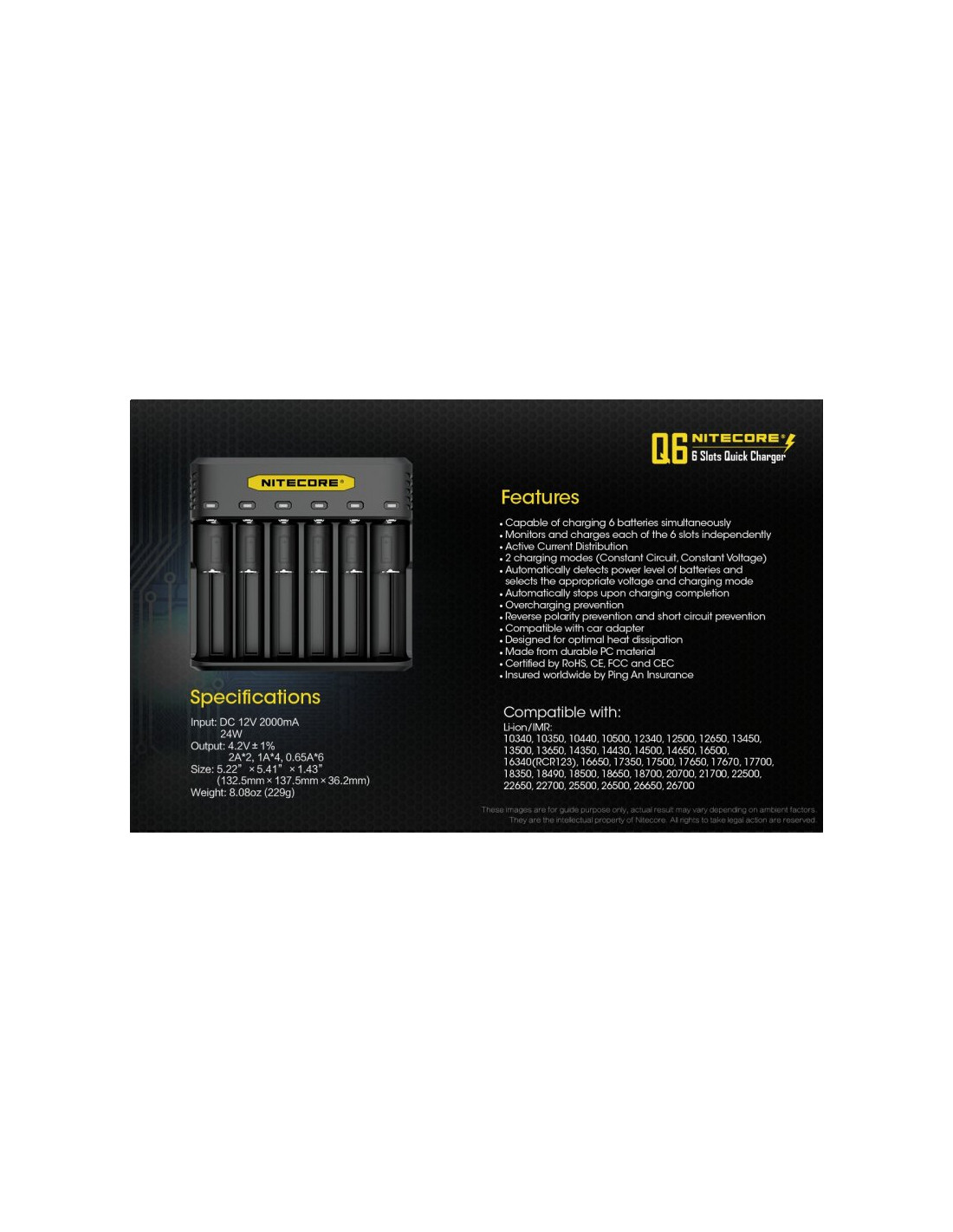 Ładowarka Nitecore Q6 to małe i łatwe w przenoszeniu urządzenie, które umożliwia swojemu użytkownikowi naładowanie do 6 akumulatorków naraz. Kompatybilne z większością akumulatorów li-on / IMR dostępnych na rynku. Dzięki niewielkiej wadze i rozmiarom idealnie sprawdza się zarówno do użytku w podróży jak i w domu.