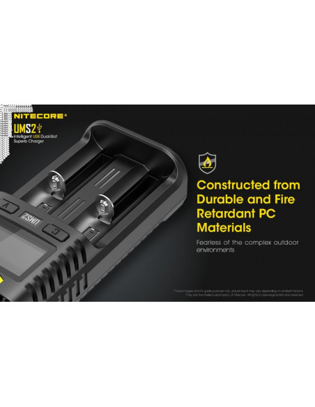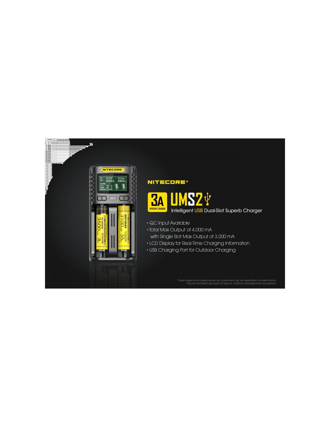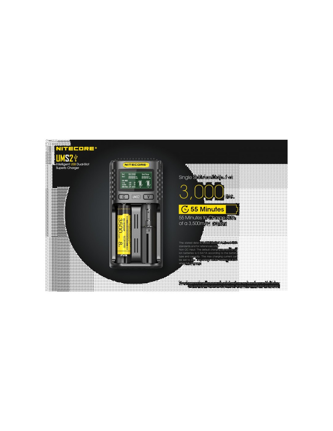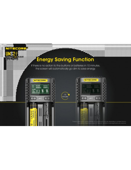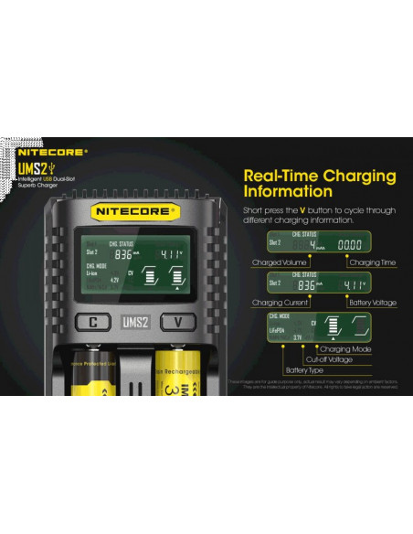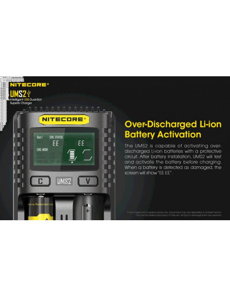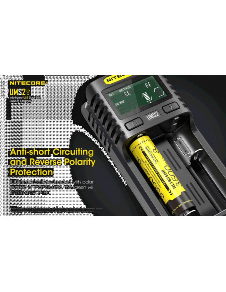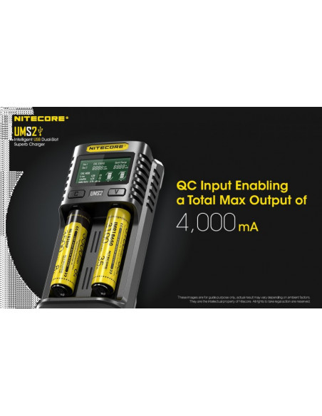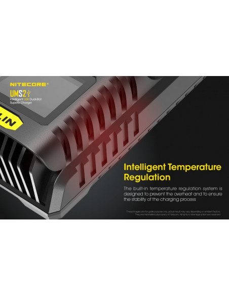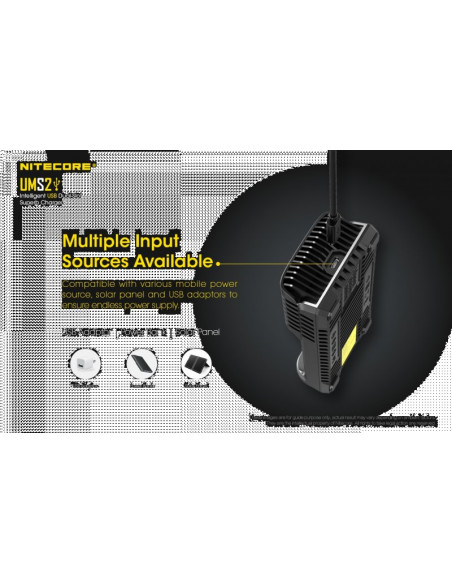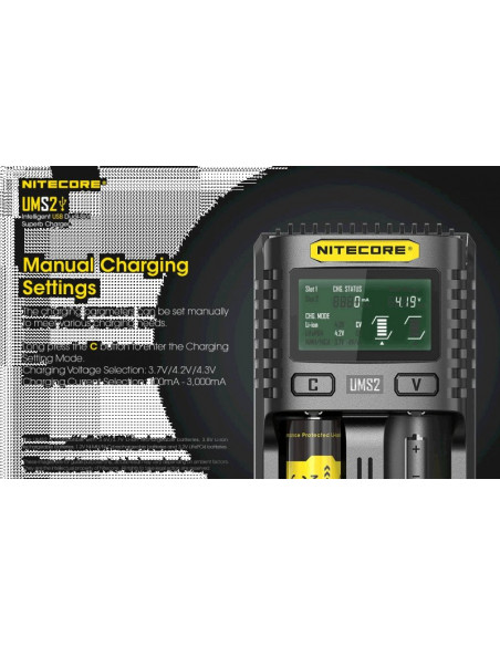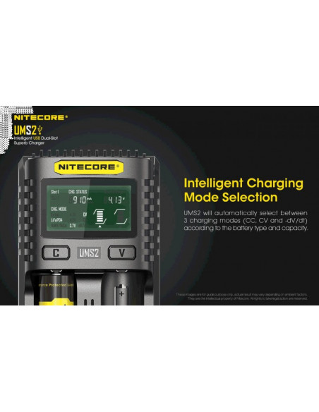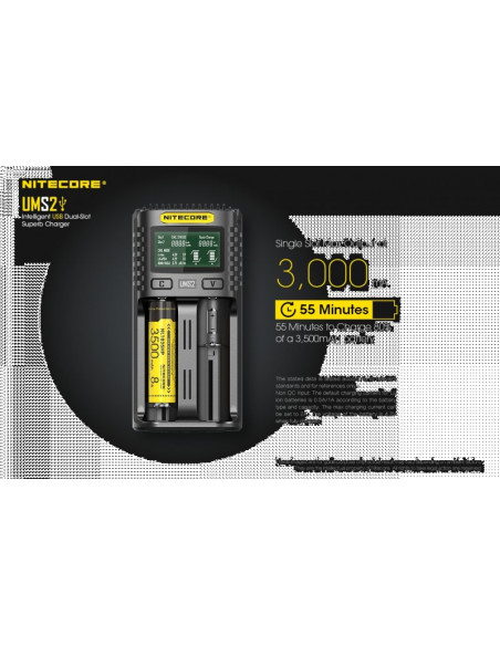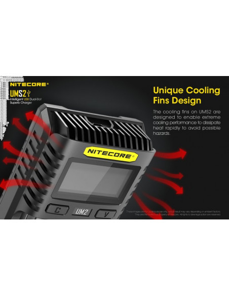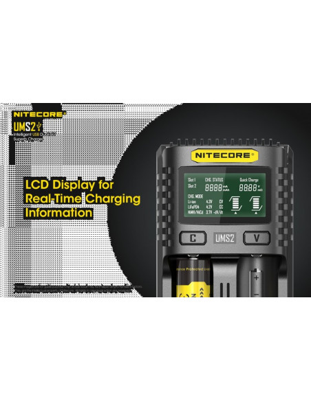 Dwukanałowa ładowarka USB Nitecore UMS2 zaprojektowana w taki sposób by podładować baterie szybko i bezpiecznie. Przy użyciu dwóch kanałów ładowania, urządzenie podaje prąd o mocy 4000mA, przy pojedynczym kanale uruchamia się tryb „Quick Charge” podający prąd o mocy 3000mA. Ładowarka posiada wyświetlacz LCD, na którym wyświetlane są informacje dotyczące ładowanych akumulatorów. Dodatkowo posiada możliwość ręcznego ustawiania parametrów ładowania.