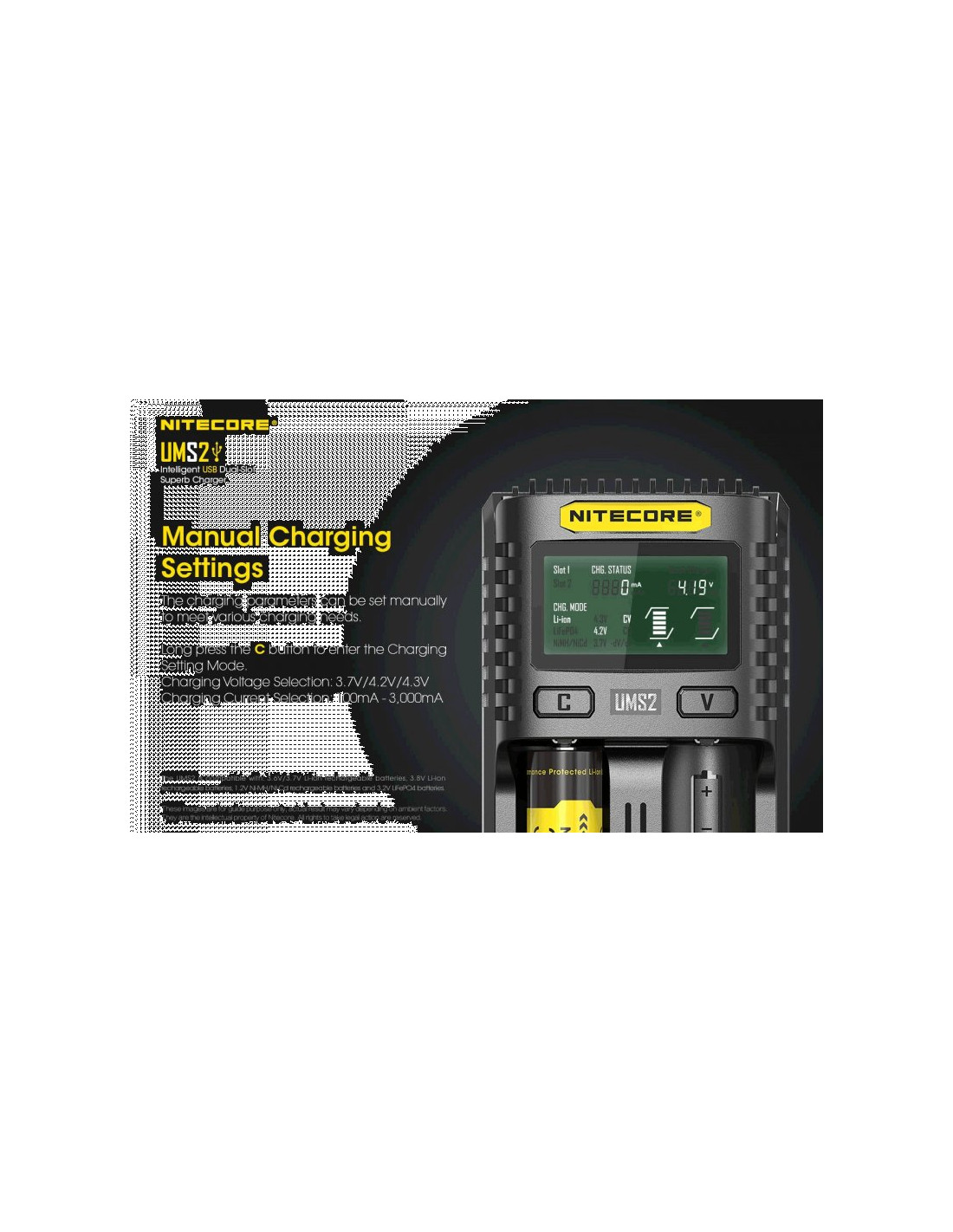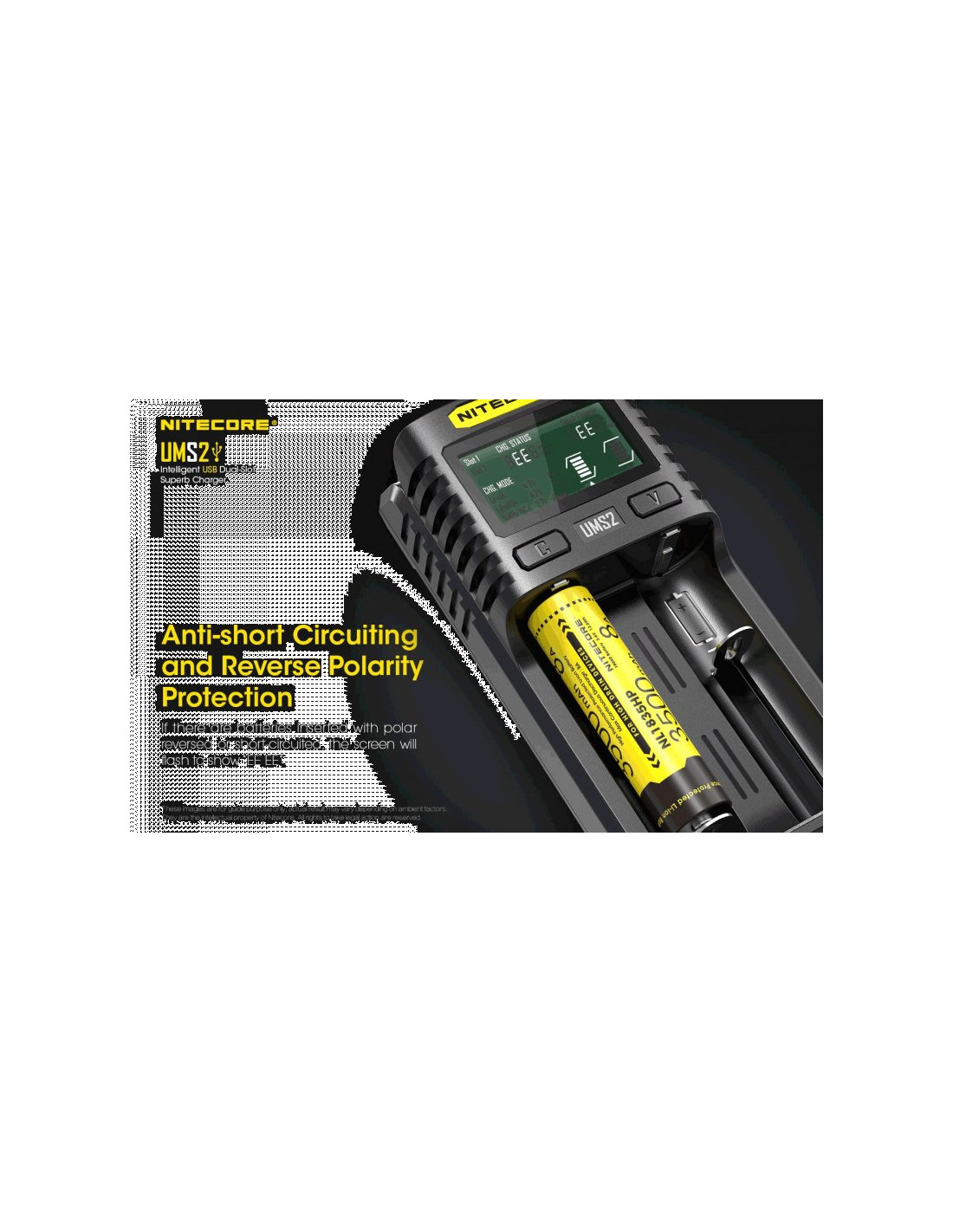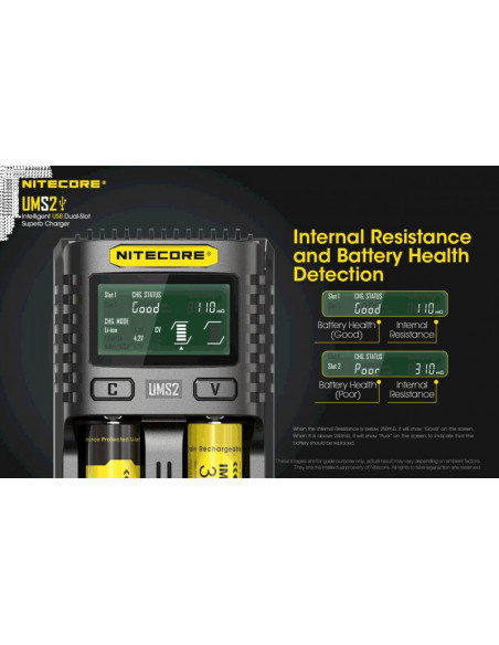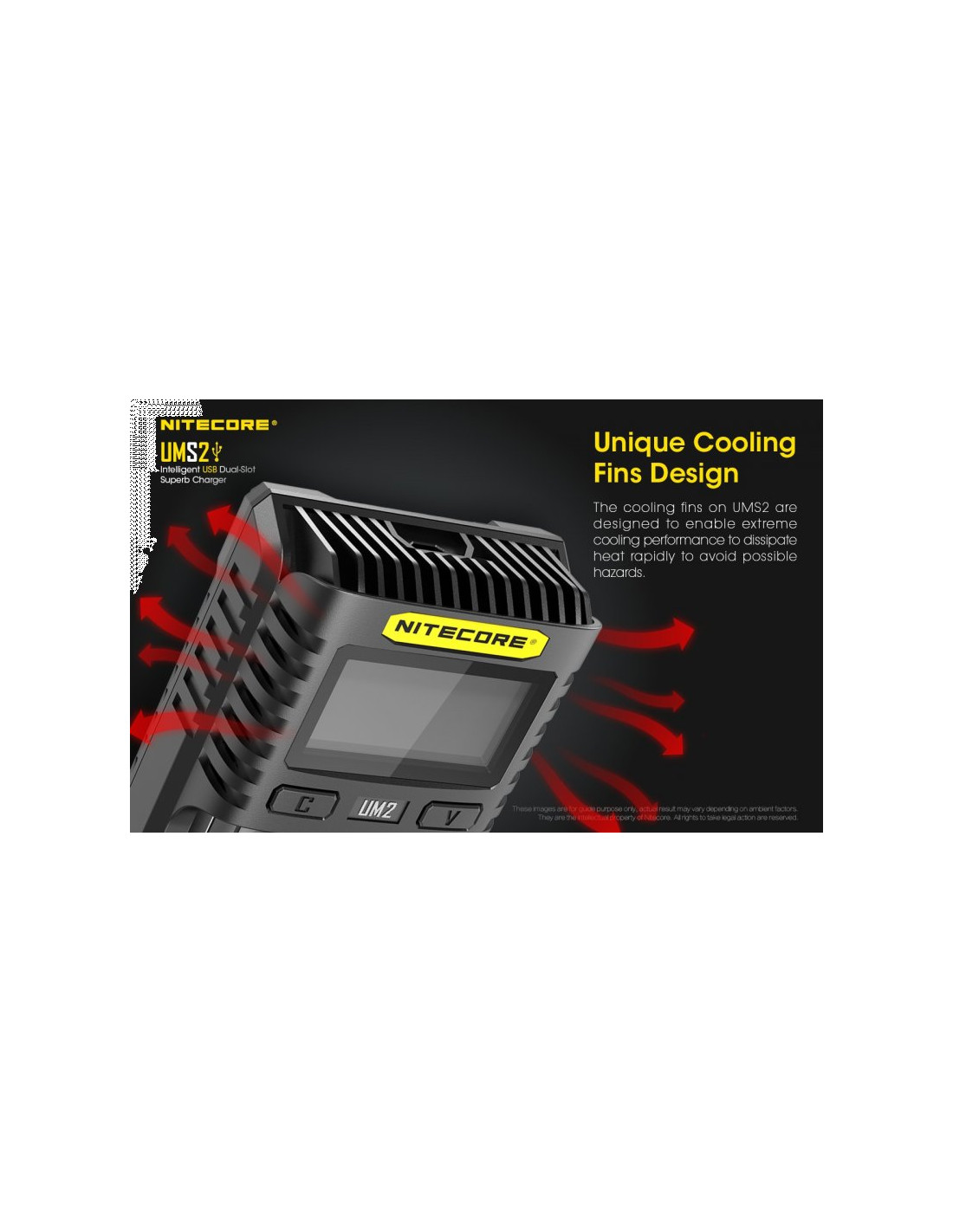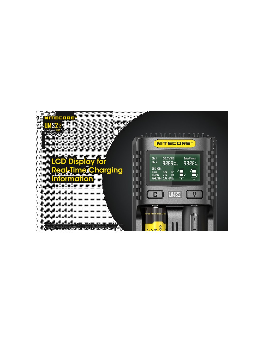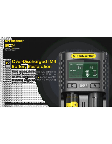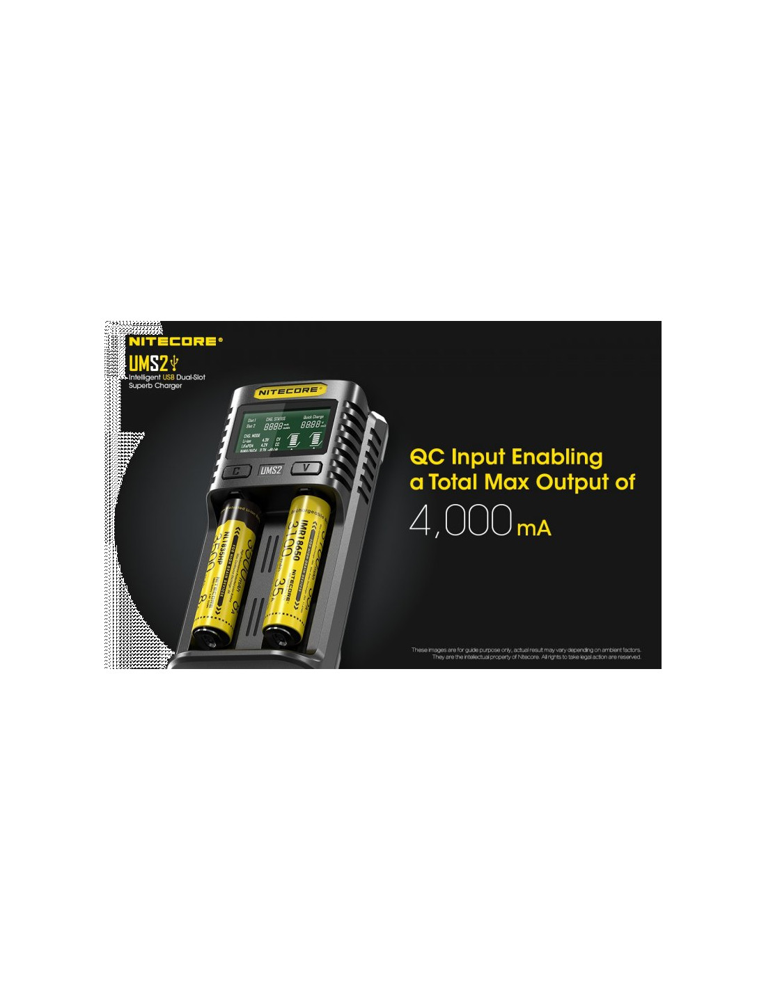 Dwukanałowa ładowarka USB Nitecore UMS2 zaprojektowana w taki sposób by podładować baterie szybko i bezpiecznie. Przy użyciu dwóch kanałów ładowania, urządzenie podaje prąd o mocy 4000mA, przy pojedynczym kanale uruchamia się tryb „Quick Charge” podający prąd o mocy 3000mA. Ładowarka posiada wyświetlacz LCD, na którym wyświetlane są informacje dotyczące ładowanych akumulatorów. Dodatkowo posiada możliwość ręcznego ustawiania parametrów ładowania.