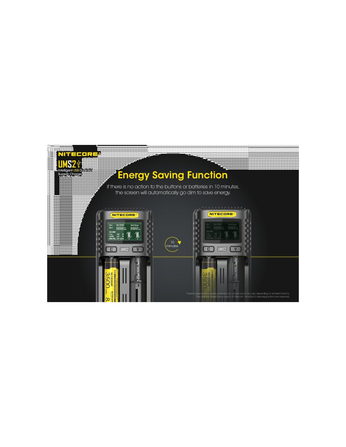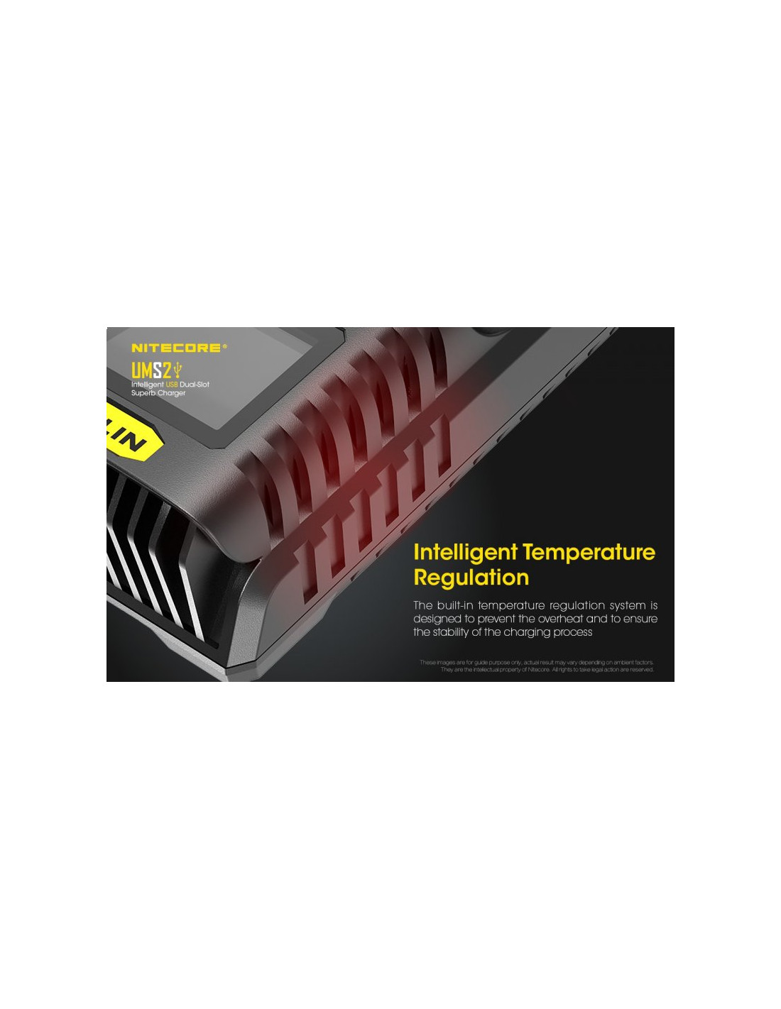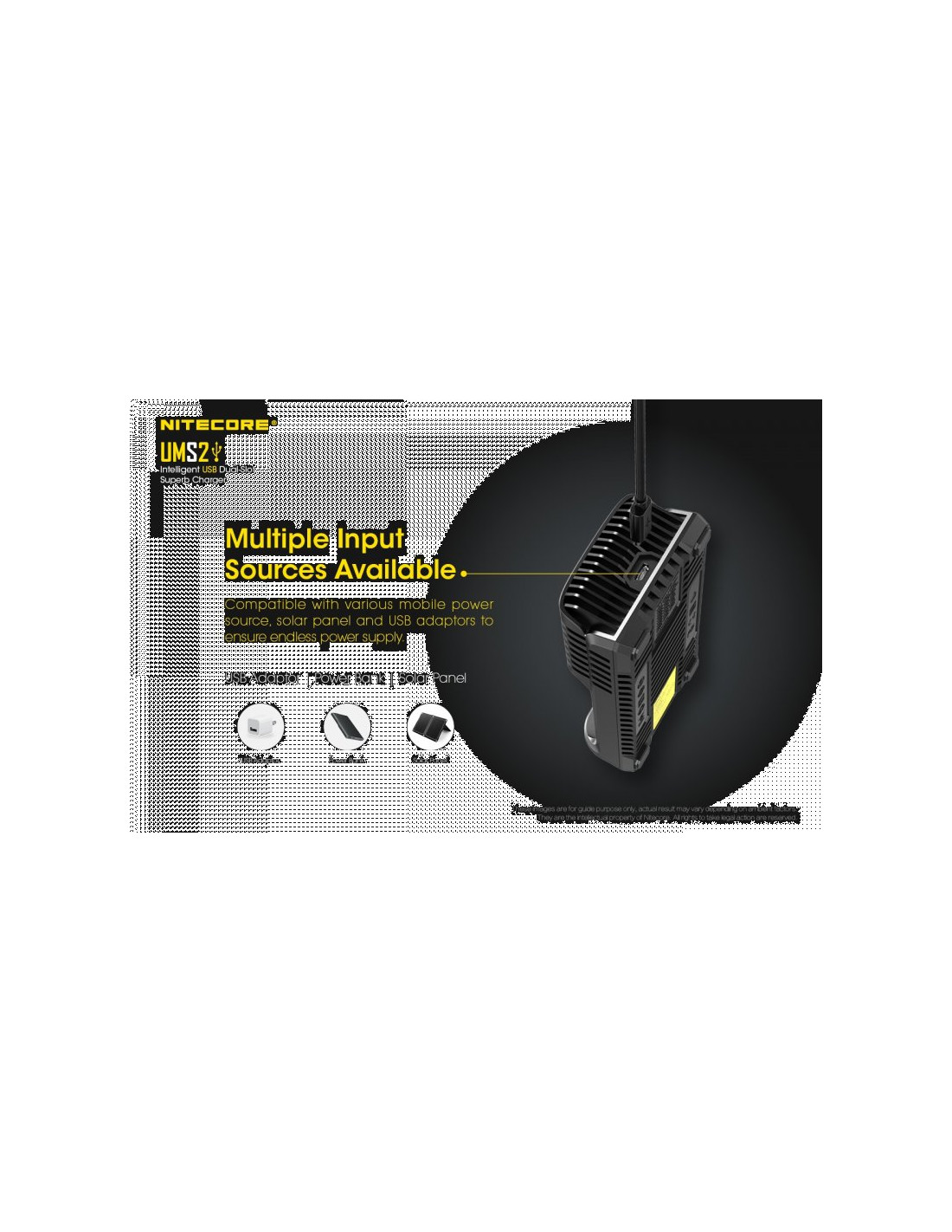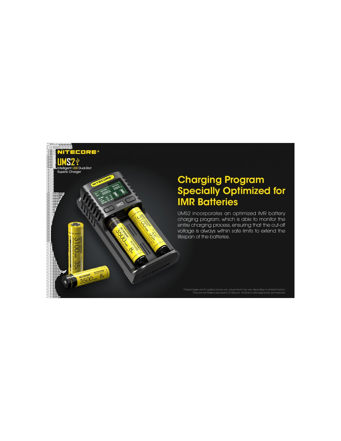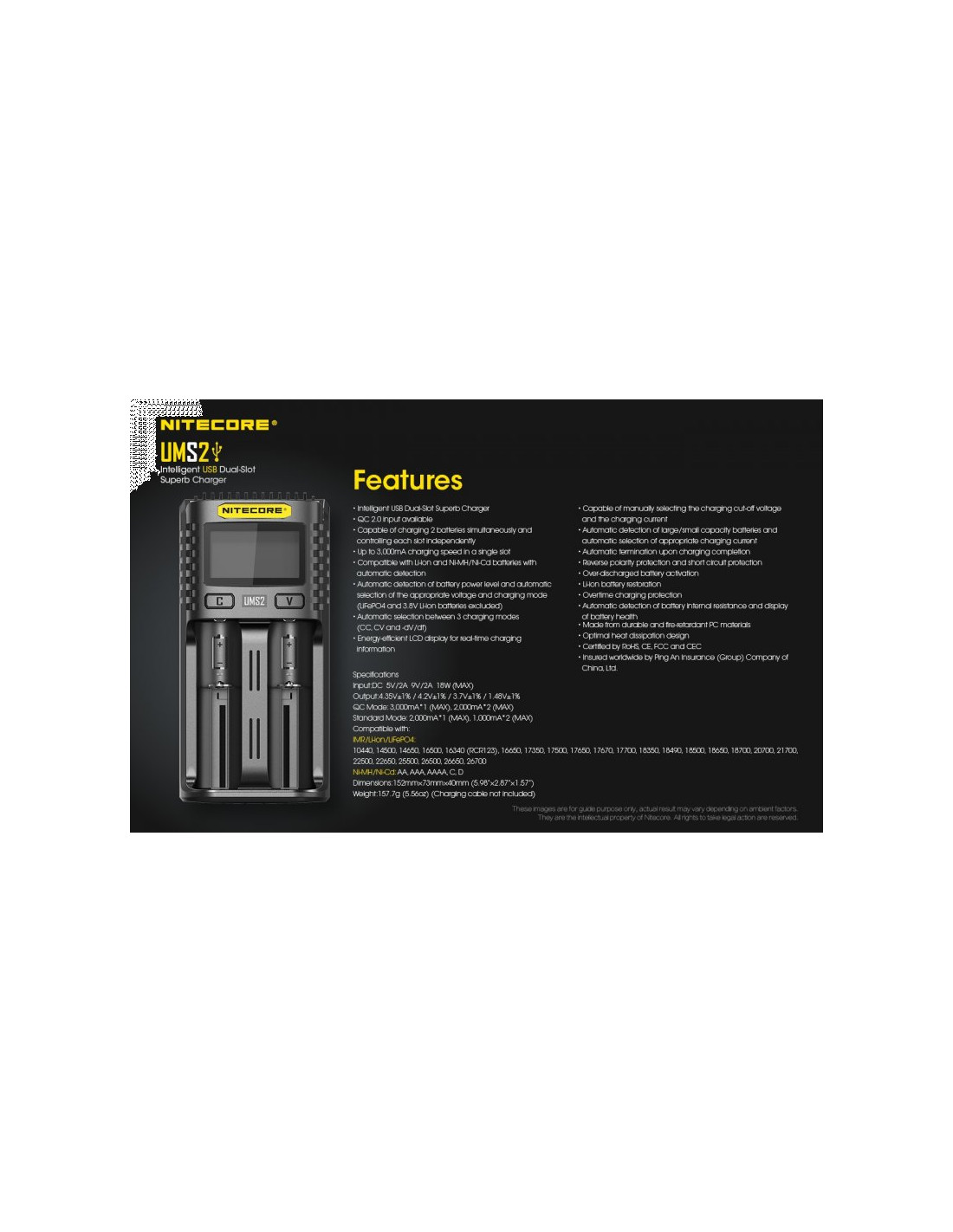 Dwukanałowa ładowarka USB Nitecore UMS2 zaprojektowana w taki sposób by podładować baterie szybko i bezpiecznie. Przy użyciu dwóch kanałów ładowania, urządzenie podaje prąd o mocy 4000mA, przy pojedynczym kanale uruchamia się tryb „Quick Charge” podający prąd o mocy 3000mA. Ładowarka posiada wyświetlacz LCD, na którym wyświetlane są informacje dotyczące ładowanych akumulatorów. Dodatkowo posiada możliwość ręcznego ustawiania parametrów ładowania.