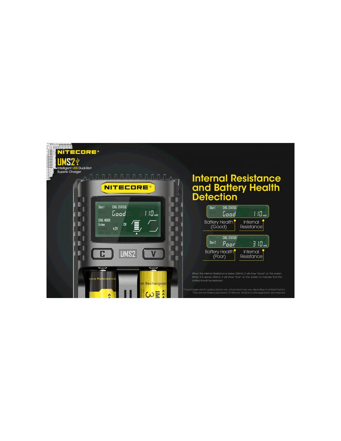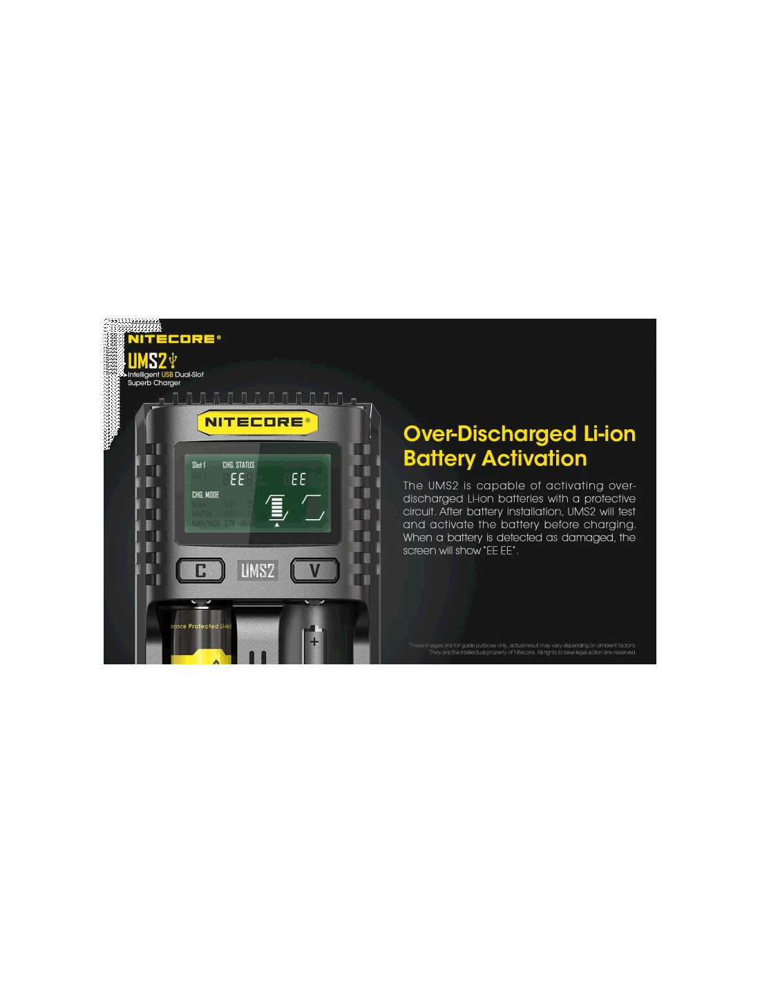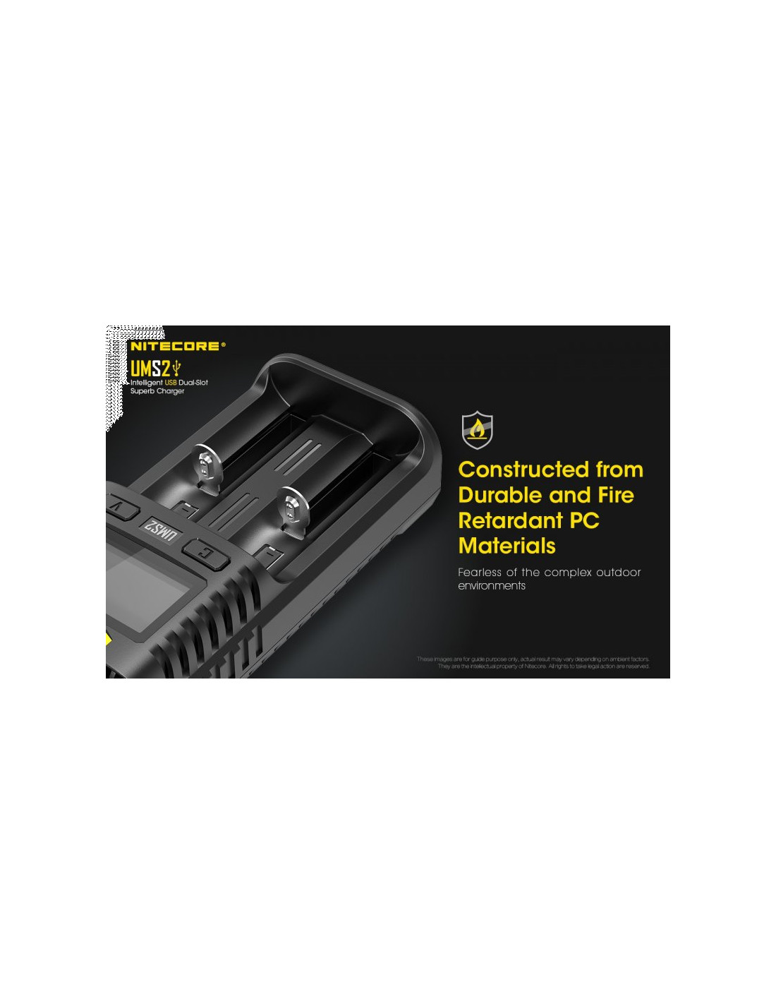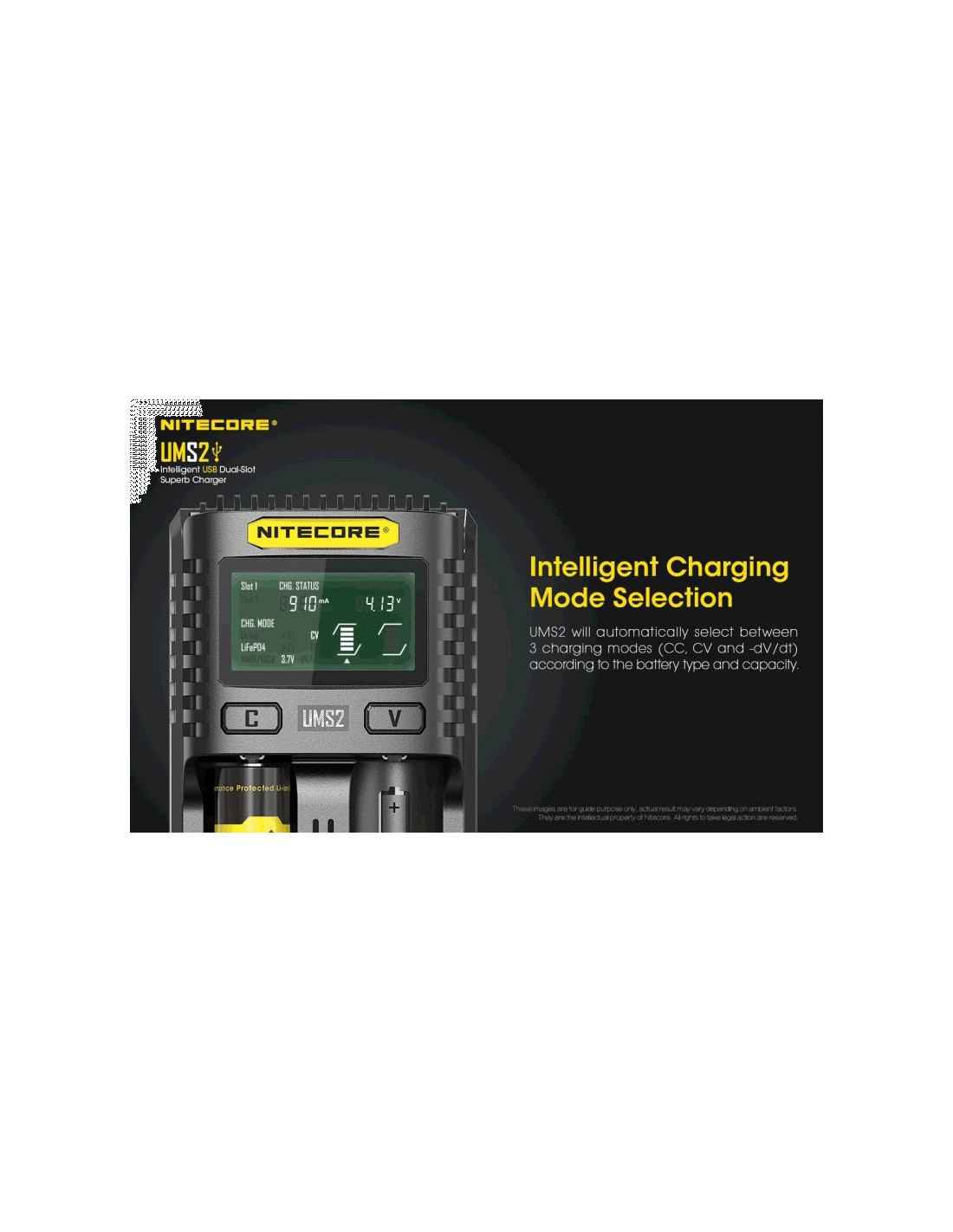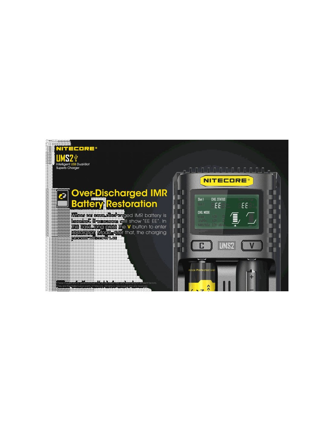 Dwukanałowa ładowarka USB Nitecore UMS2 zaprojektowana w taki sposób by podładować baterie szybko i bezpiecznie. Przy użyciu dwóch kanałów ładowania, urządzenie podaje prąd o mocy 4000mA, przy pojedynczym kanale uruchamia się tryb „Quick Charge” podający prąd o mocy 3000mA. Ładowarka posiada wyświetlacz LCD, na którym wyświetlane są informacje dotyczące ładowanych akumulatorów. Dodatkowo posiada możliwość ręcznego ustawiania parametrów ładowania.