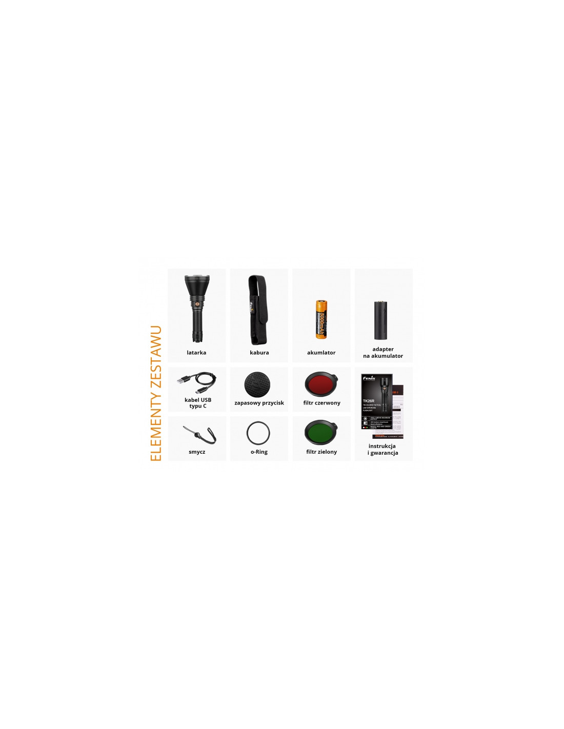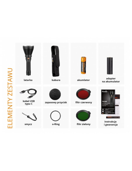 - Elementy zestawu latarki: akumulator Fenix ARB-L21-5000 21700 5000 mAh ,