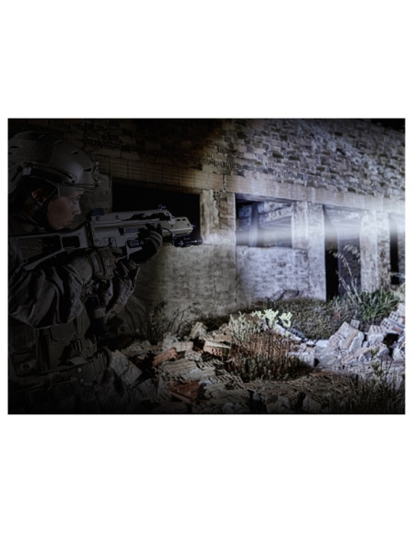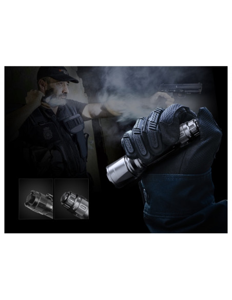 Do obsługi latarki służy obrotowy pierścień (do zmiany grup trybów) i tylny włącznik taktyczny odpowiedzialny za włączanie/ wyłączanie, zmianę jasności (w trybie Duty) oraz aktywację światła chwilowego