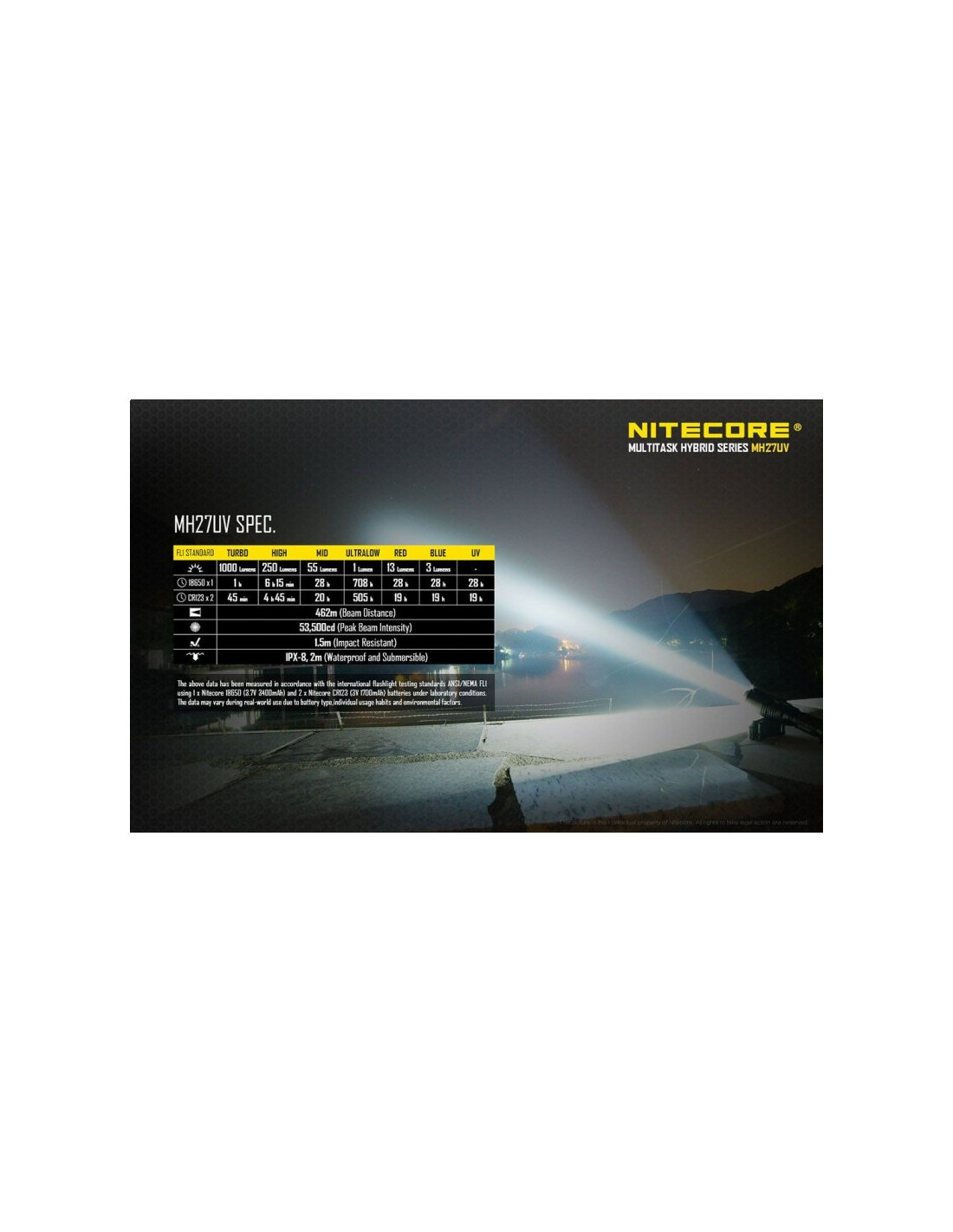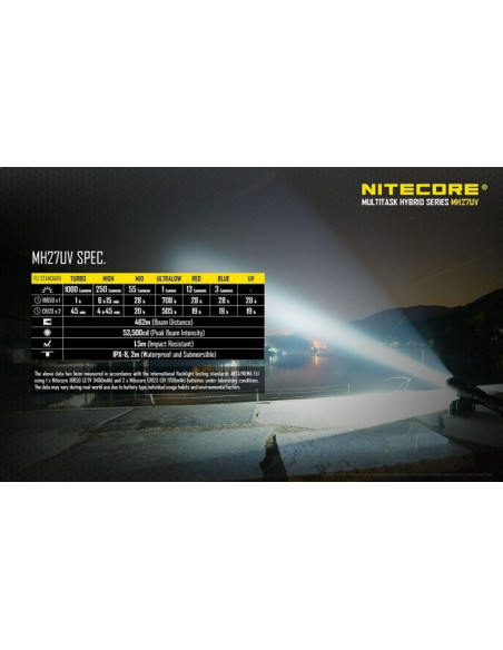 Użytkownik latarki MH27UV otrzymuje do dyspozyji cztery poziomy mocy, światło czerwone, niebieskie i ultrafioletowe. MH27UV zasilane jest akumulatorem 18650 lub dwiema bateriami CR123. Bateria nie znajdują się w zestawie i należy je kupić oddzielnie. Maksymalny czas pracy latarki przy najniższym trybie wynosi 708 godzin. Zasięg wiązki światła wynosi 462 metry.
