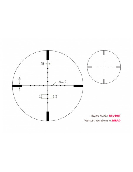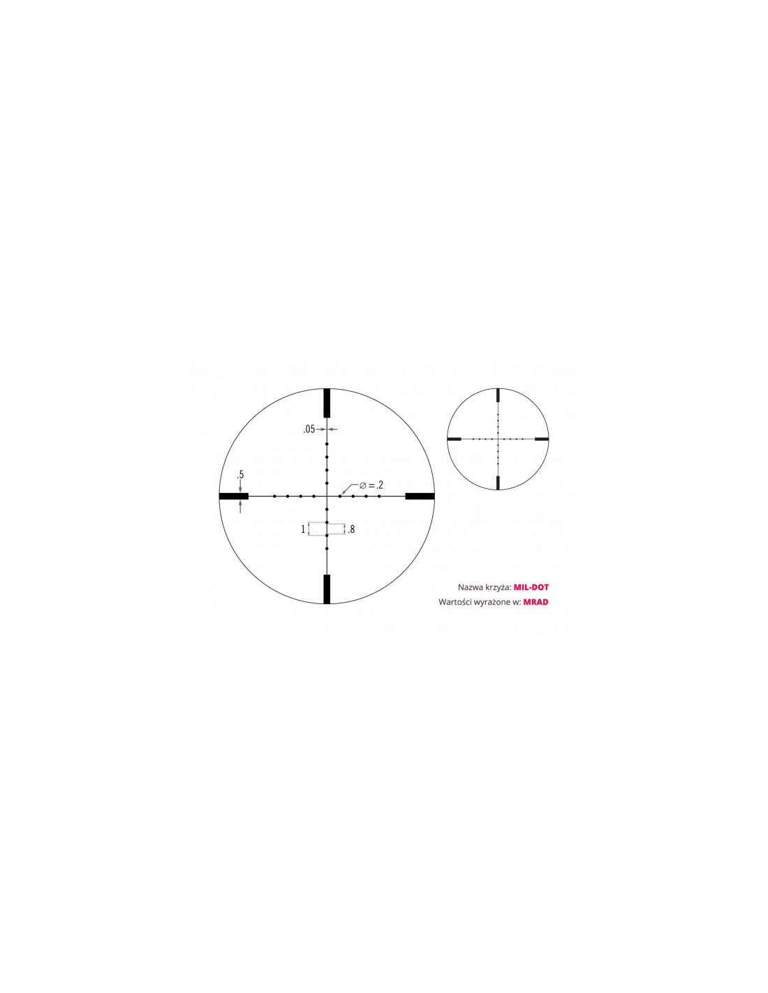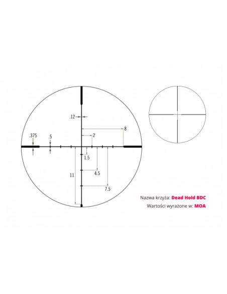- Typ krzyża celowniczego (siatki): Dead-Hold® BDC MOA, MILDOT MOA