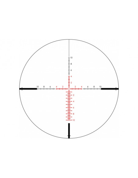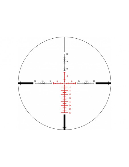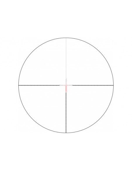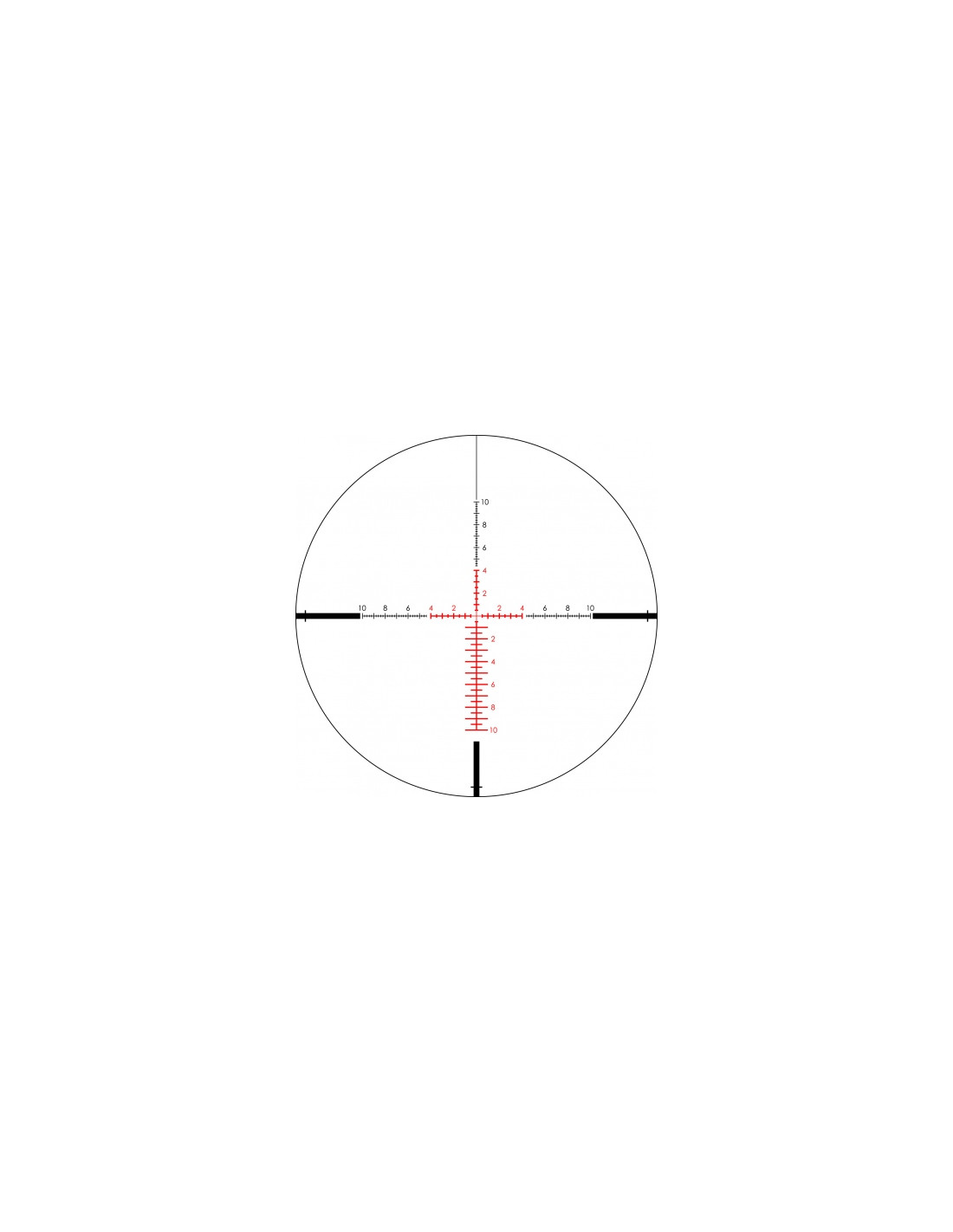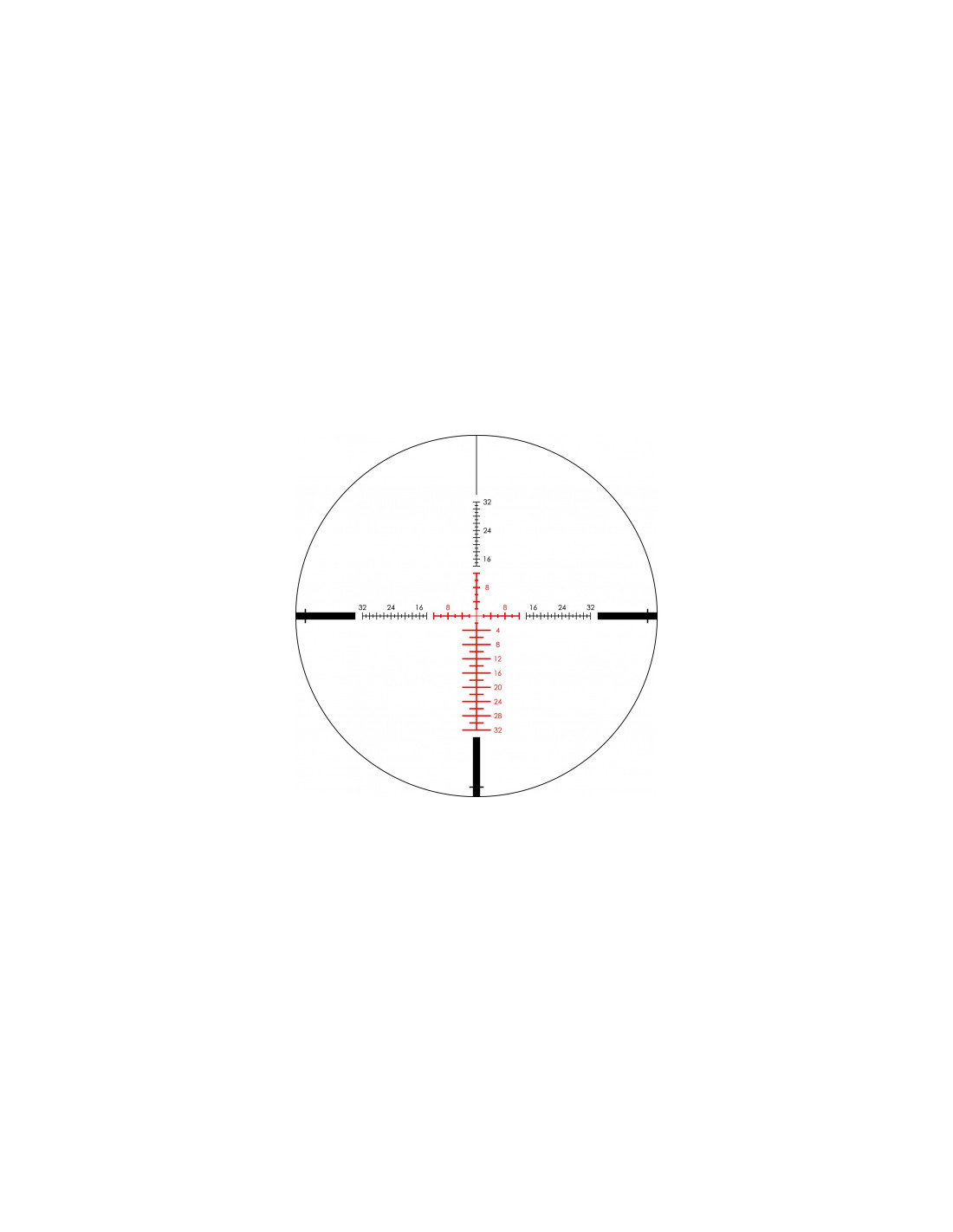 - Krzyż na pierwszym planie - skala krzyża jest proporcjonalna do wielkości przybliżonego celu. Stałe podziałki pozwalają na dokładne namierzenie celu na całym zakresie przybliżenia