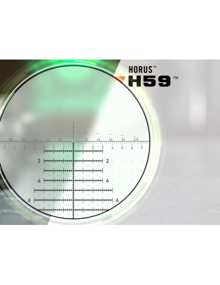 - Krzyż na pierwszym planie - skala krzyża jest proporcjonalna do wielkości przybliżonego celu. Stałe podziałki pozwalają na dokładne namierzenie celu na całym zakresie przybliżenia
