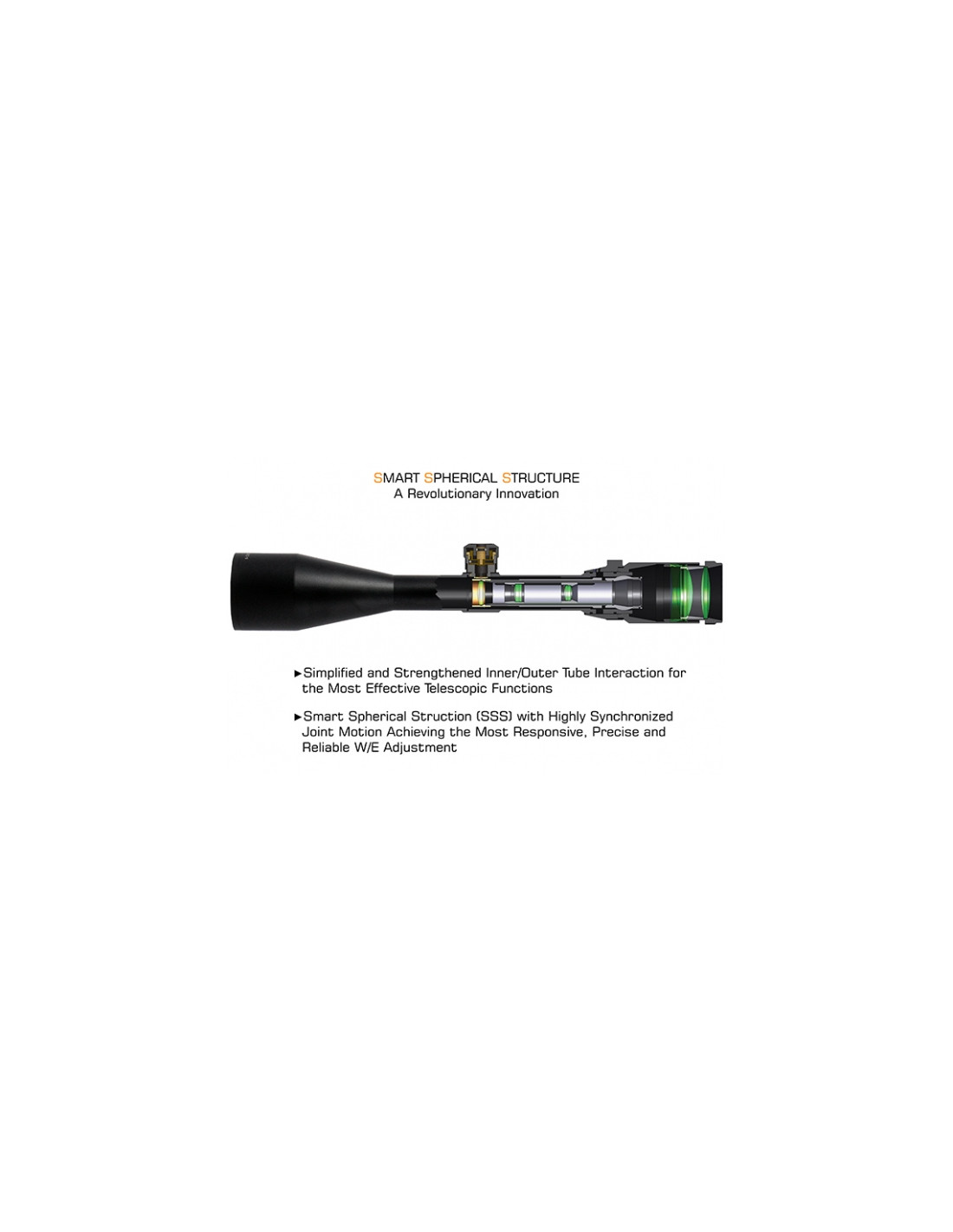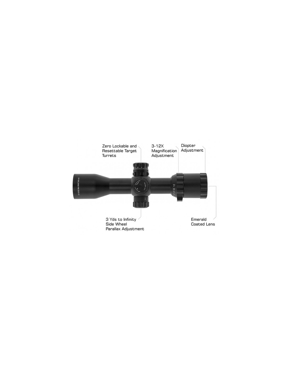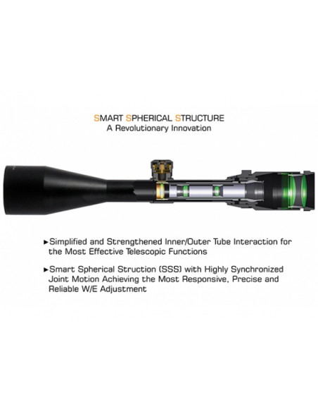 Duża odległość od oka (max. 109 mm), zmienne powiększenie 3-12 ×, szerokie pole widzenia oraz precyzyjna regulacja paralaksy (od 2,7 m do nieskończoności) powodują, że optyka ma wszechstronne zastosowanie i może być montowana na różnego rodzajach broni.