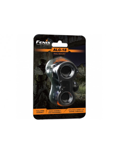Montaż wykonano z aluminium A6061-T6 i poddano procesowi twardego anodowaniu HA-III. Gwarantuje to zwiększoną odporność na wytarcie i zarysowania. Fenix Montaż ALG-18 pozwala na użytkowanie latarki na karabinku lub strzelbie nieposiadających odpowiedniej szyny. Do instalacji montażu nie potrzebujemy żadnych narzędzi, wystarczy umieścić i zablokować latarkę w obejmie i kompletny moduł przyczepić do lufy broni. Gumowe wkładki w obejmach chronią metalowe powierzchnie przed zarysowanie oraz zapobiegają przesuwaniu się montażu/ latarki pod wpływem energii odrzutu. Montaż ma duży zakres regulacji dzięki temu może być mocowany na broni z lufą o średnicy zewnętrznej 18-23 mm. Do Fenix ALG-18 pasują latarki o średnicy korpusu 2,5-28 mm z głowicą mniejszą niż 70 mm.