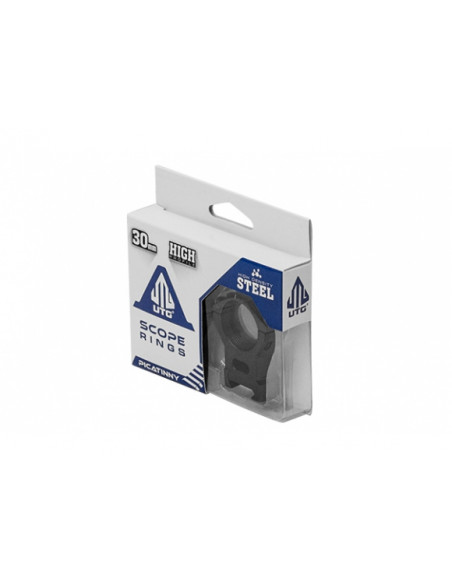 Montaż stalowy UTG, dwuczęściowy wysoki do mocowania optyki o tubusie 30 mm na szynie Weaver/Picatinny.