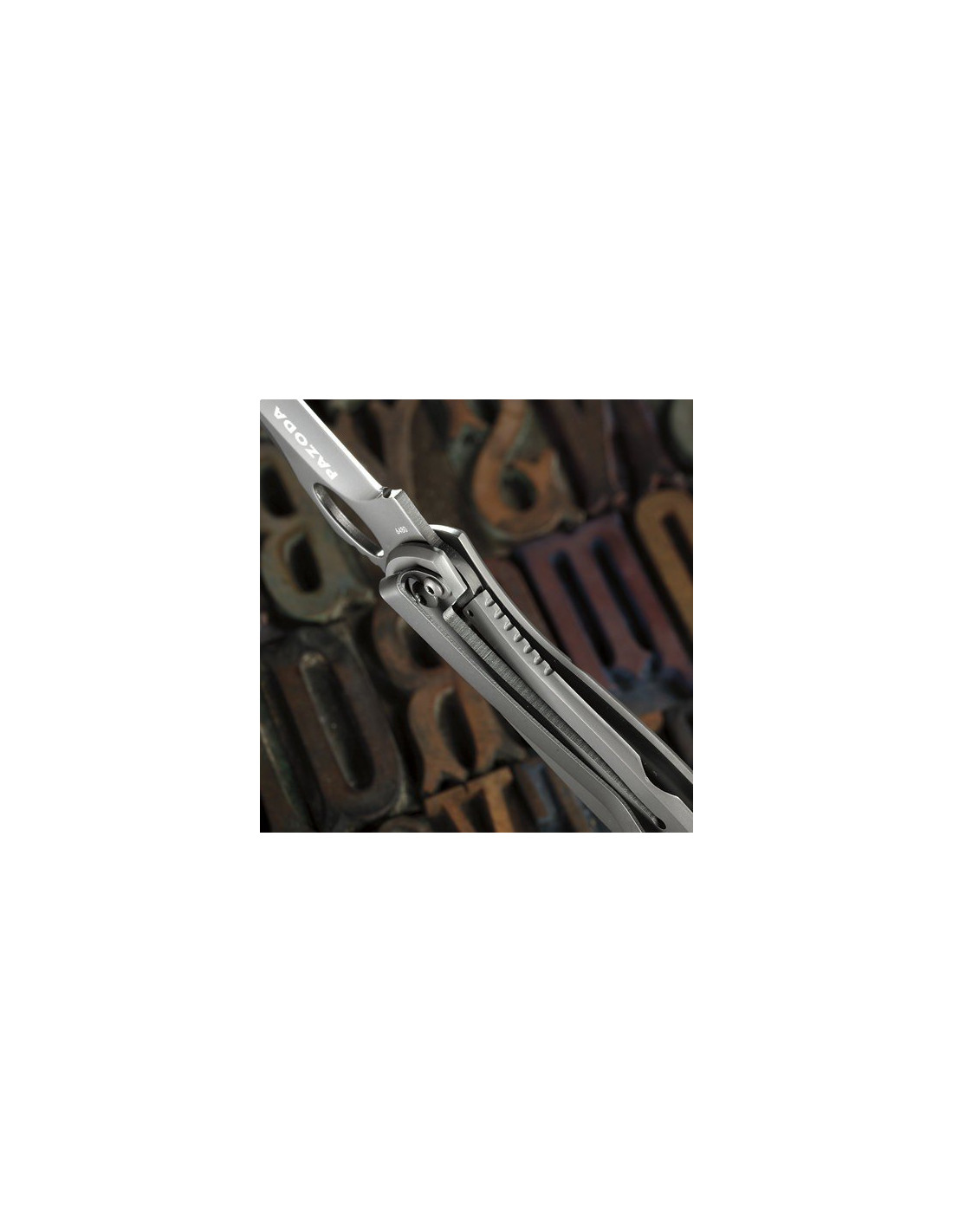Pazoda jest stylowym nożem składanym z ostrzem wykonanym ze stali 8Cr14MoV, pokrytym azotkiem tytanu dla zmaksymalizowania odporności na korozję. Owalny otwór na głowni umożliwia szybkie otwieranie.