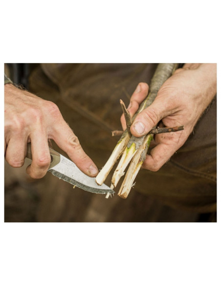 Głownia o optymalnej długości roboczej (82 mm) ma użytkowy profil drop-point oraz tradycyjny szlif skandynawski, cechujący się wspaniałymi właściwościami tnącymi. Płaski grzbiet klingi o 90° kącie świetnie sprawdza się we współpracy z krzesiwem, ułatwiając rozpalanie ognia.