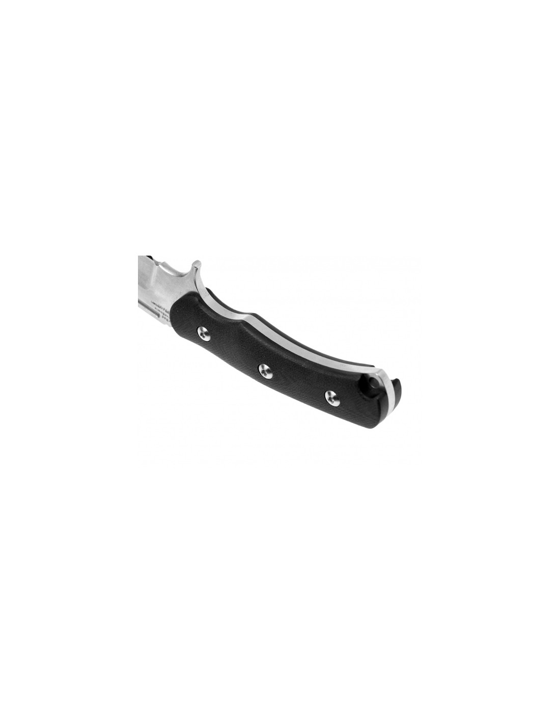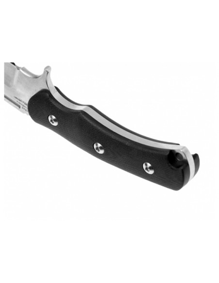 Rękojeść noża tworzą profilowane okładziny z matowego laminatu G-10, zapewniające wygodny i pewny chwyt. W zakończeniu rękojeści znajduje się otwór umożliwiający wplecenia linki lub smyczy.