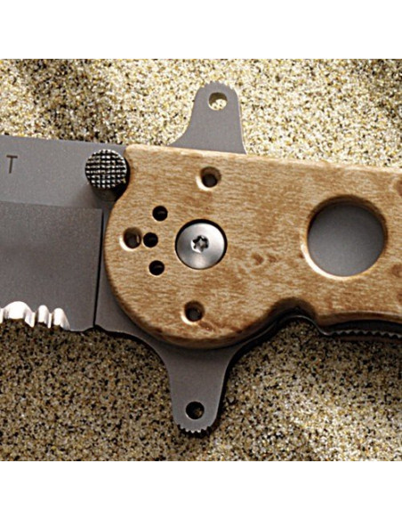 M16-14ZSF posiada okładziny rękojeści z Zytelu o barwie piaskowej i charakterystyczym wzorem, szeroką rękojeść umożliwiająca pewny chwyt zarówno w rękawiczkach jak i gołą dłonią, linery ze stali nierdzewnej 420J2, ostrze ze stali AUS 8, o współczynniku twardości 55-57HRC, z unikalnym ząbkowaniemTriple-Point Serrations.